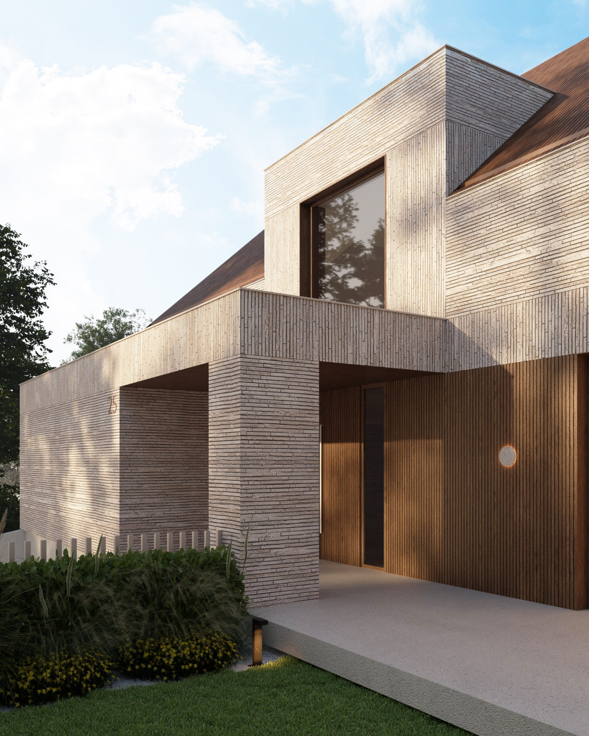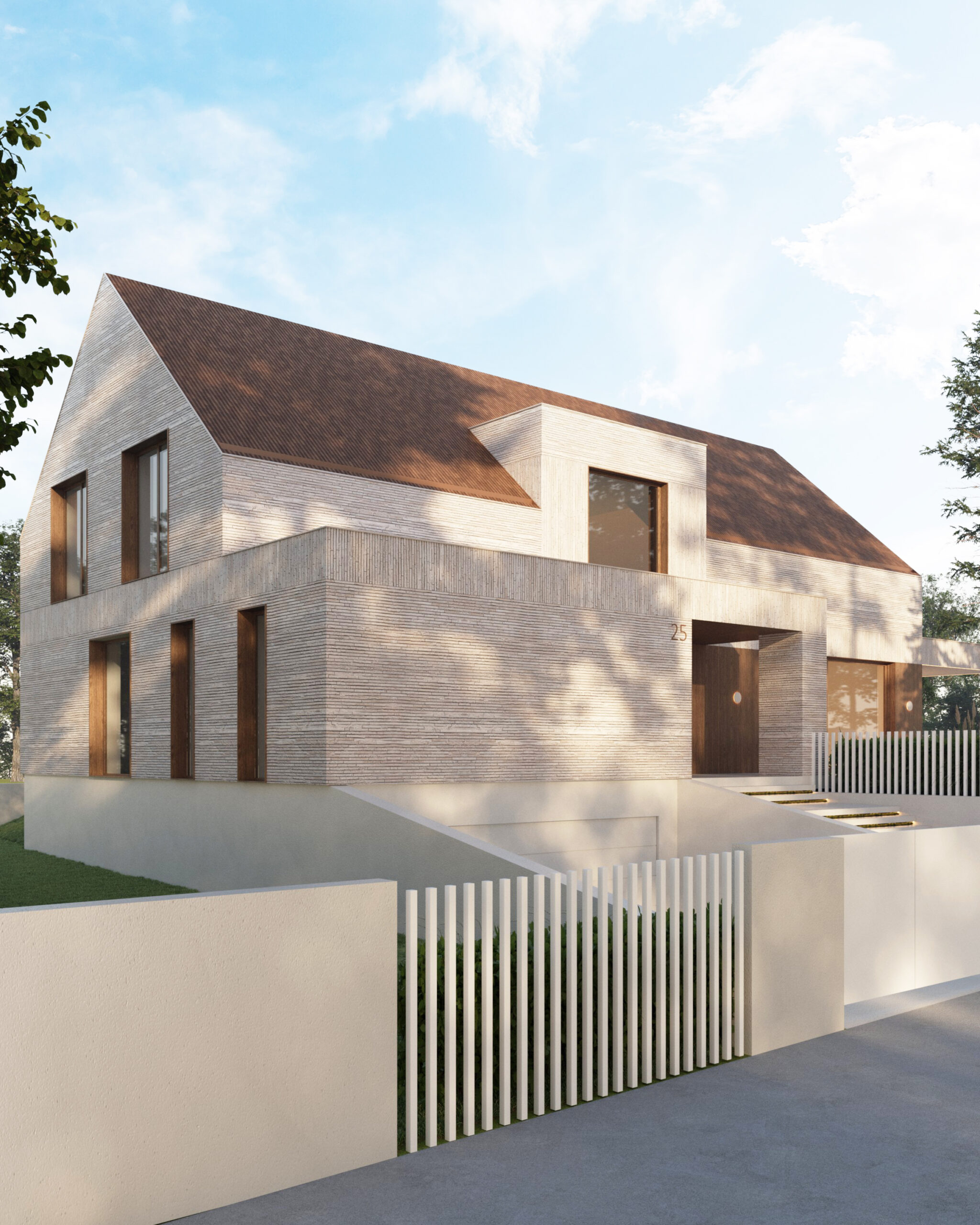 „(…) W architekturze budynku dużo się dzieje: 3 kondygnacje, zadaszenia wejściowe i nad tarasem, lukarny, murki oporowe… Aby uspokoić trochę bryłę postanowiłam zastosować zabieg montażu cegły w dwóch kierunkach – w pionie i poziomie. Podzieliłam więc elewację na poziome pasy wyrównane do charakterystycznych krawędzi np. okien oraz zadaszeń. Paradoksalnie, mimo że teraz na elewacji dzieje się znacznie więcej, wizualnie zapanował na niej porządek.”