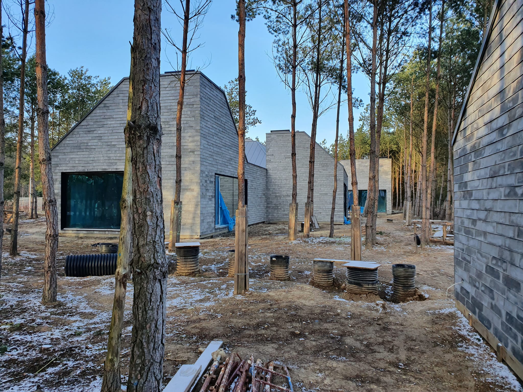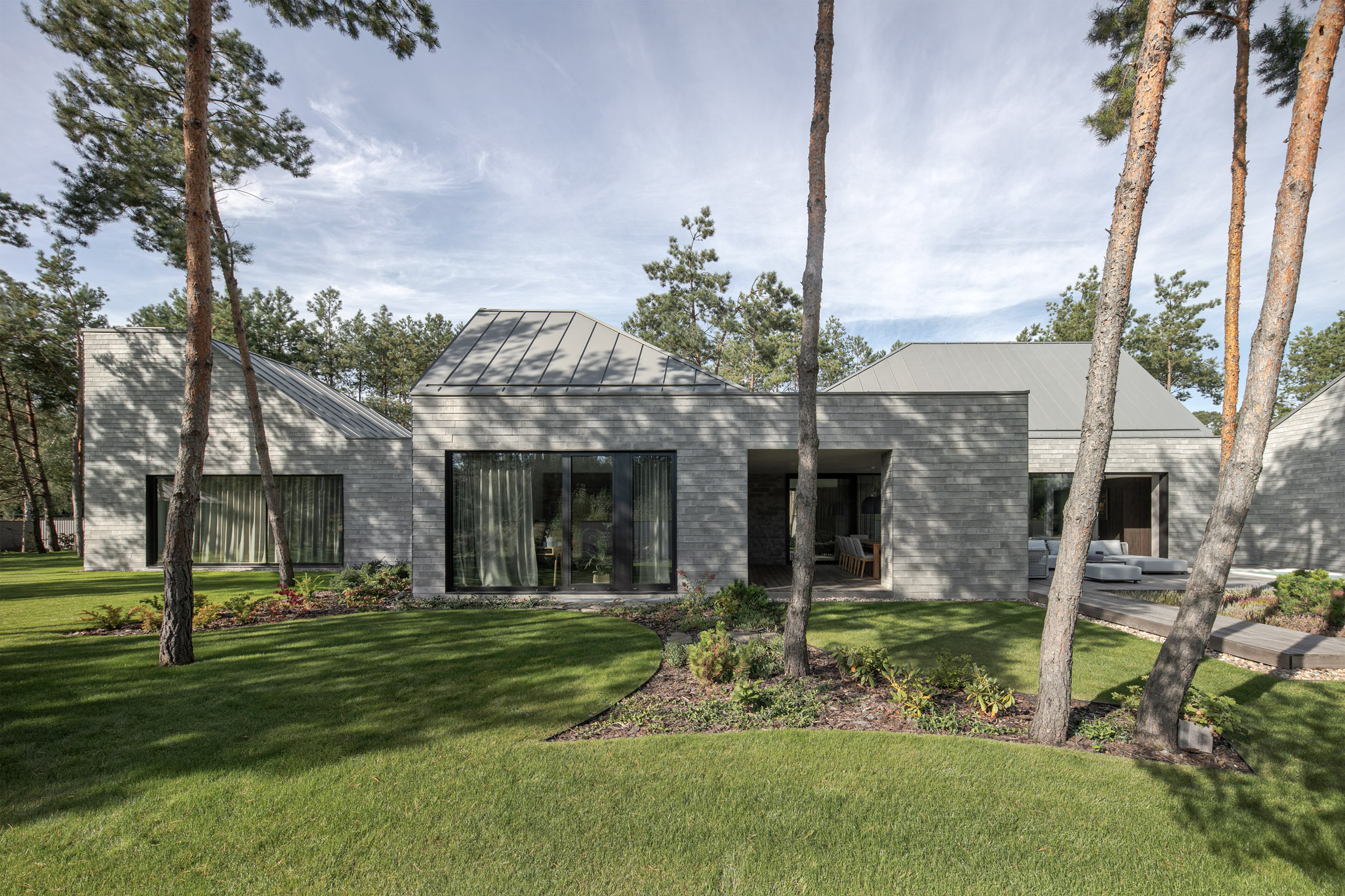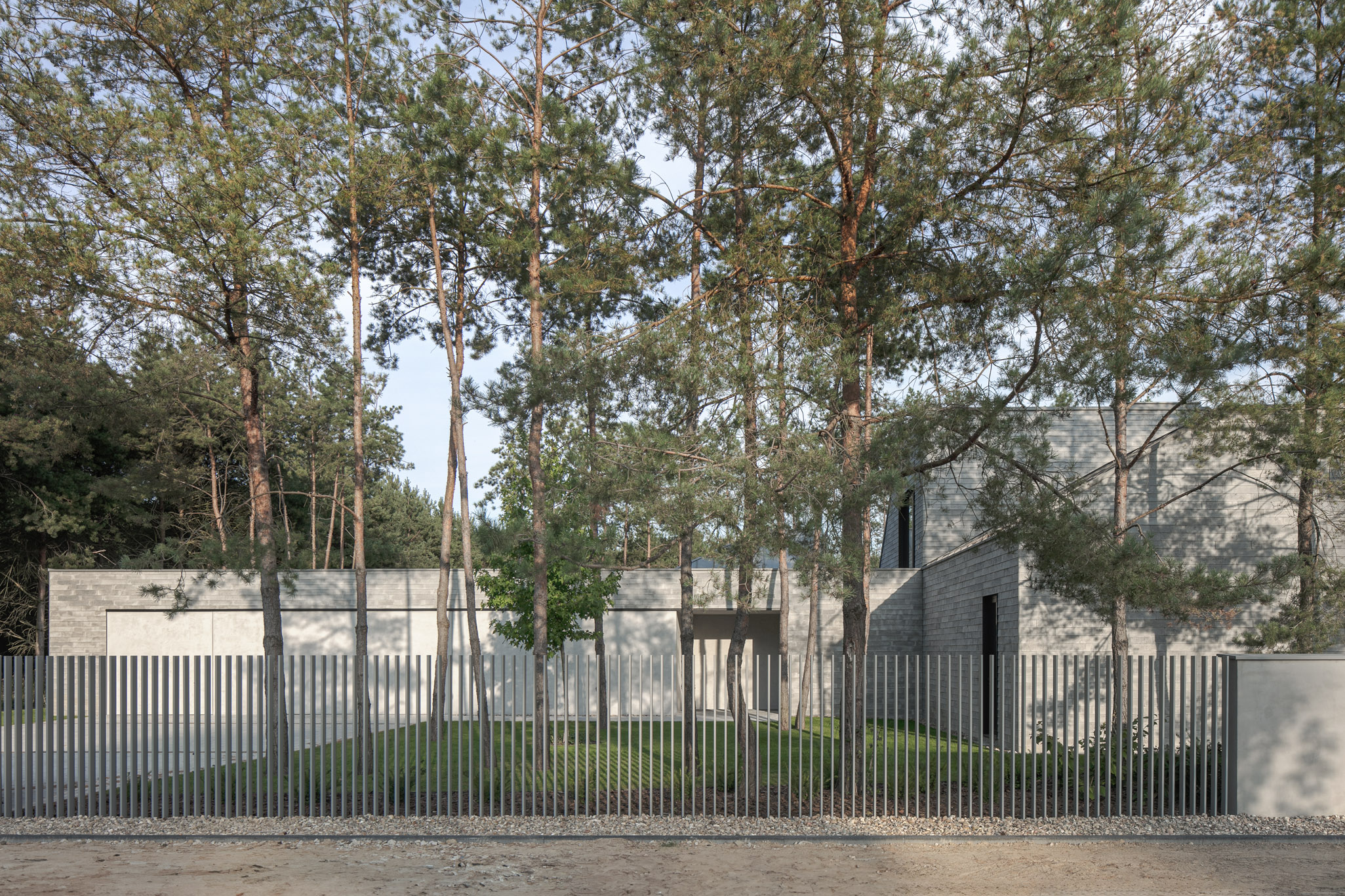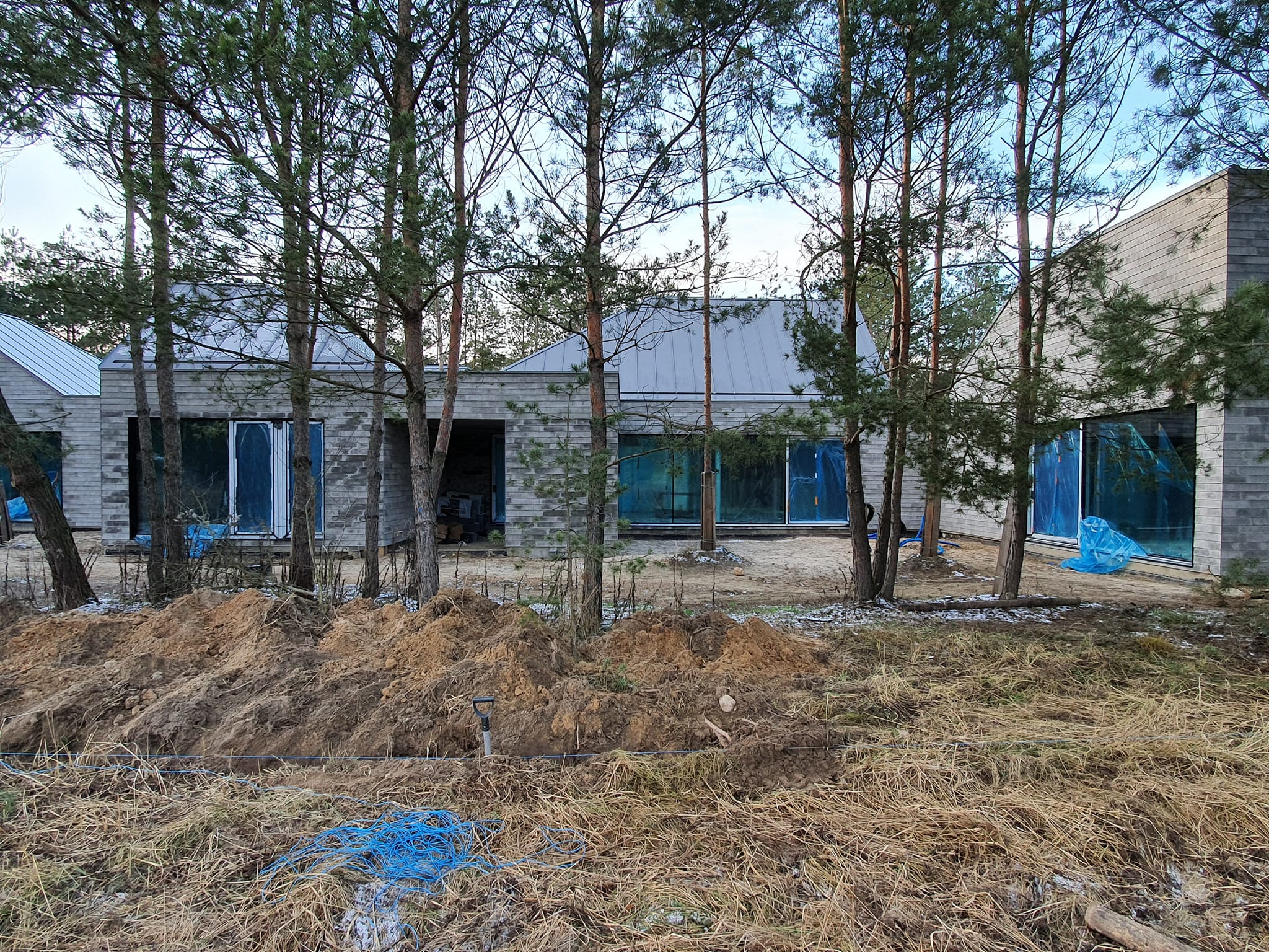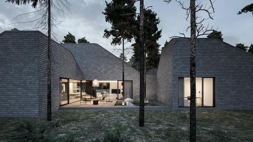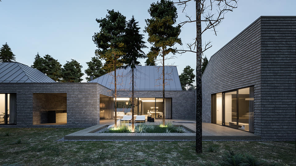 Dom Wieloczłonowy powstał z poszukiwania projektowej odpowiedzi jak dużą kubaturę i metraż domu parterowego umieścić na działce gęsto porośniętej wysokimi sosnami, by nie była przeskalowana i dominująca. W jaki sposób zapewnić bardzo dobre doświetlenie wnętrz w zacienionym drzewami środowisku. Jak otworzyć wnętrza na las przy zachowaniu intymności i przytulności dla mieszkańców. I jak znaleźć miejsce na wyeksponowanie obrazów i mebli – antyków, by nie sprawiały wrażenia przypadkowo wstawionych.
