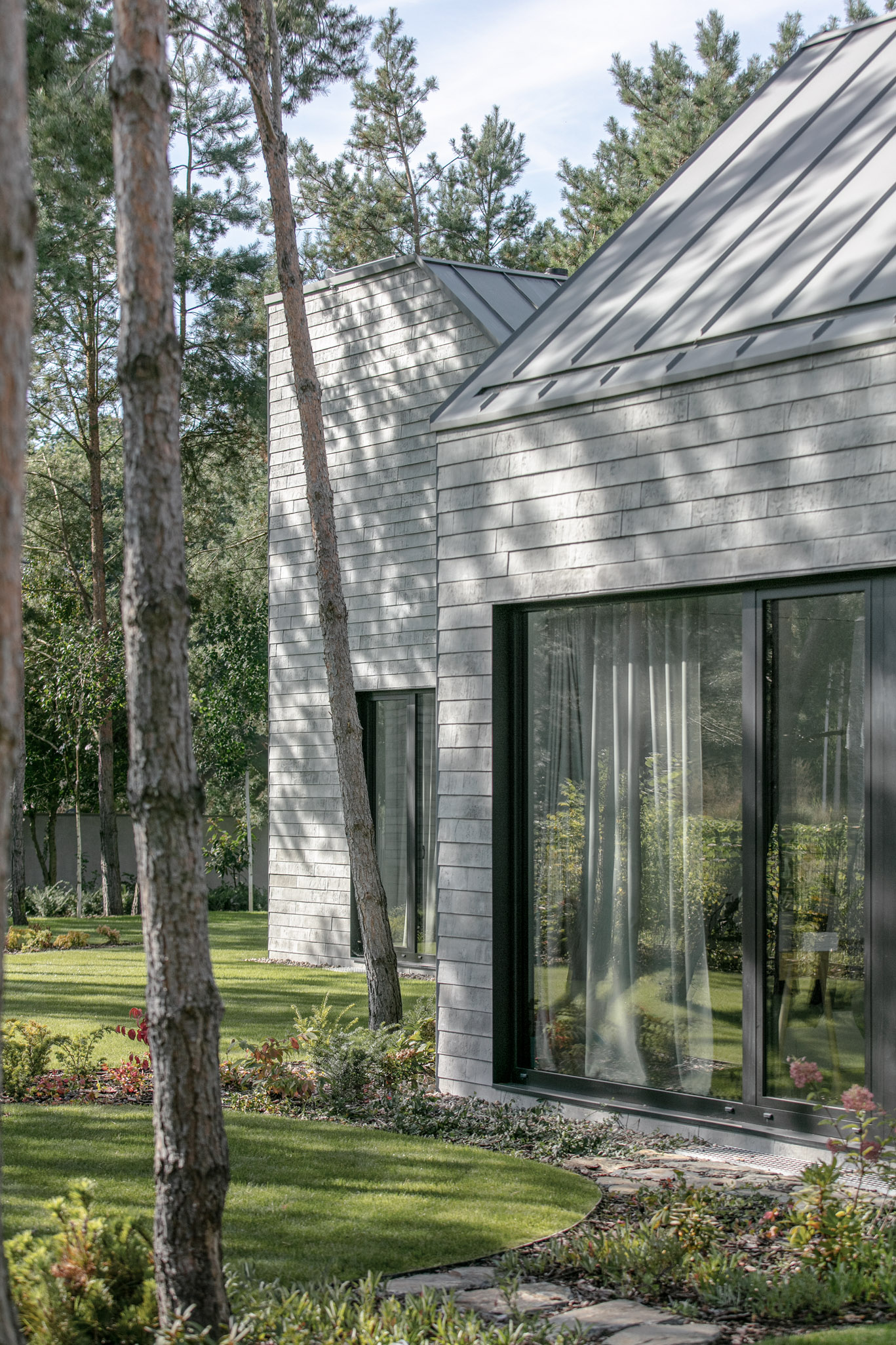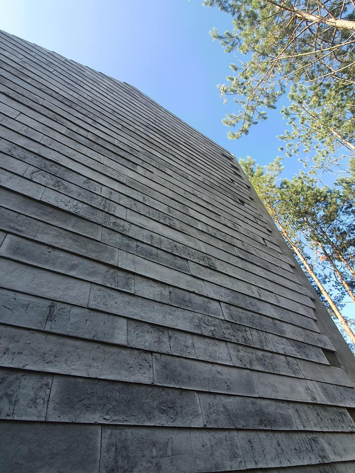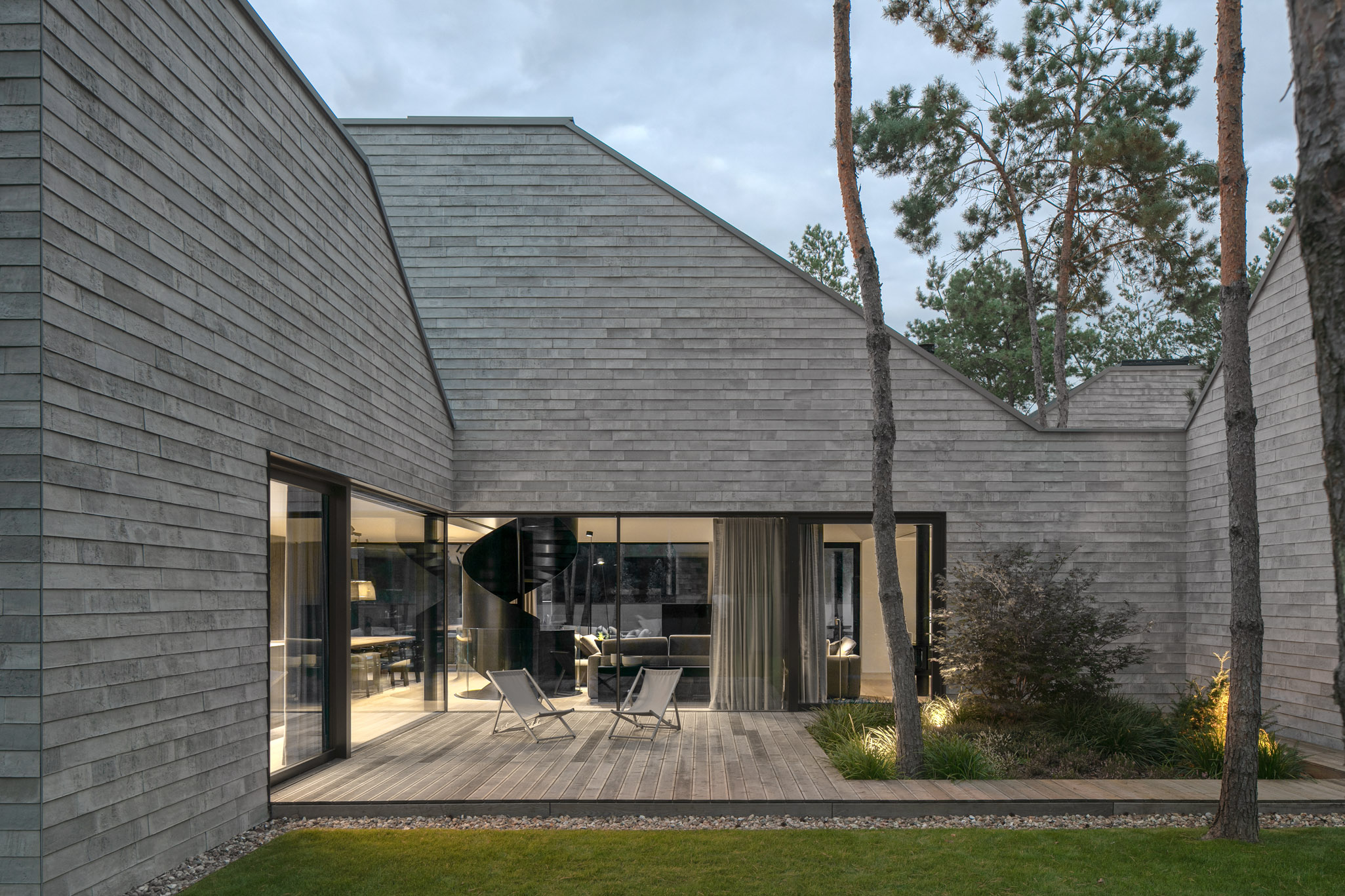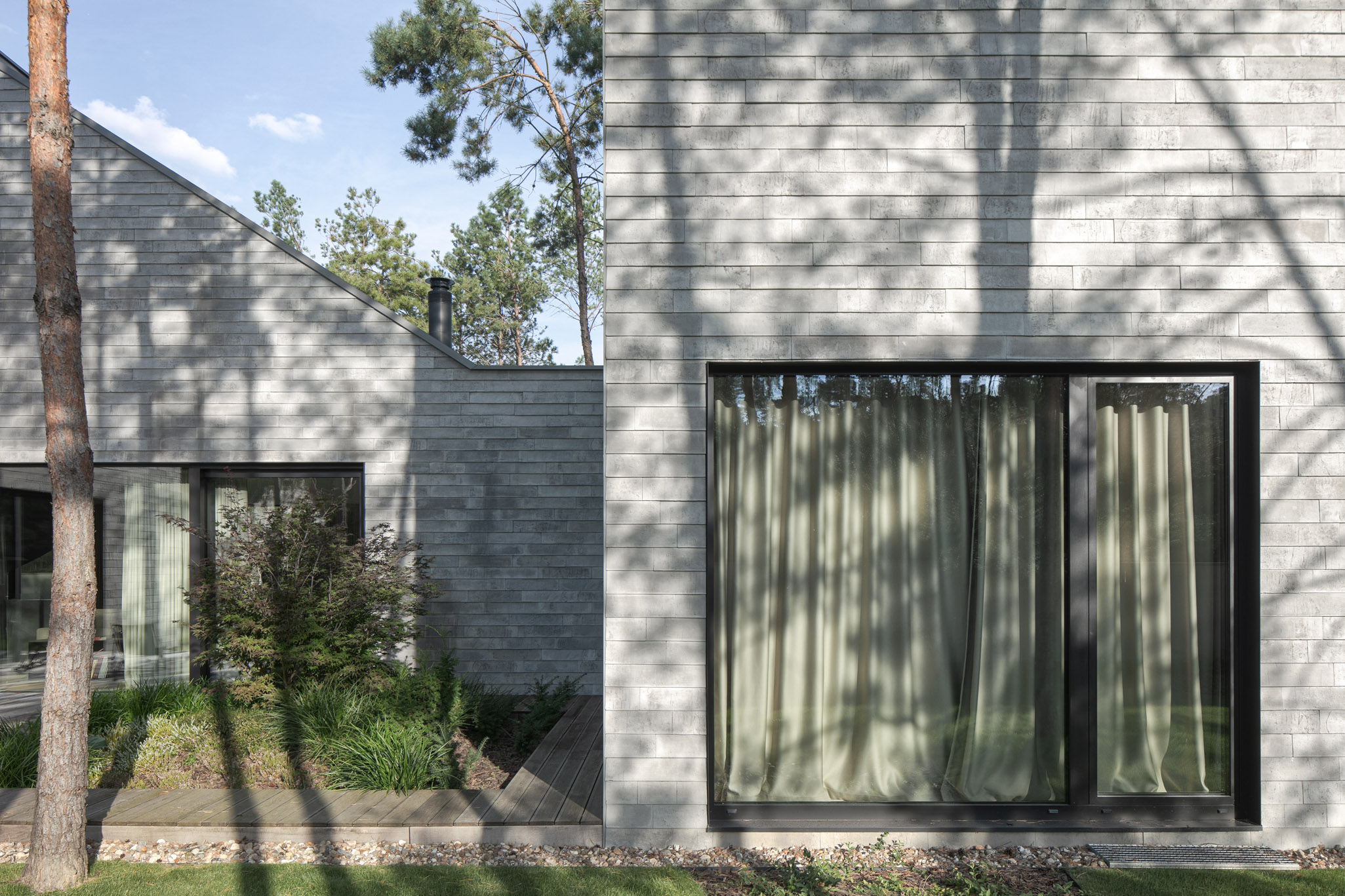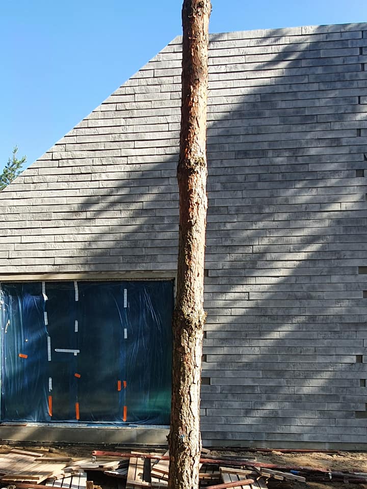 Niemal wszystkie ściany zostały obłożone specjalnie zaprojektowaną do tego domu płytka betonową: jej różnorodna i chropowata forma została ułożona niczym łuski nachodzące jedna na drugą. Z jednej strony chronią elewacje przed szybkim niszczeniem w leśnym klimacie a z drugiej są pięknym tłem do gry cień padających z pobliskich drzew.