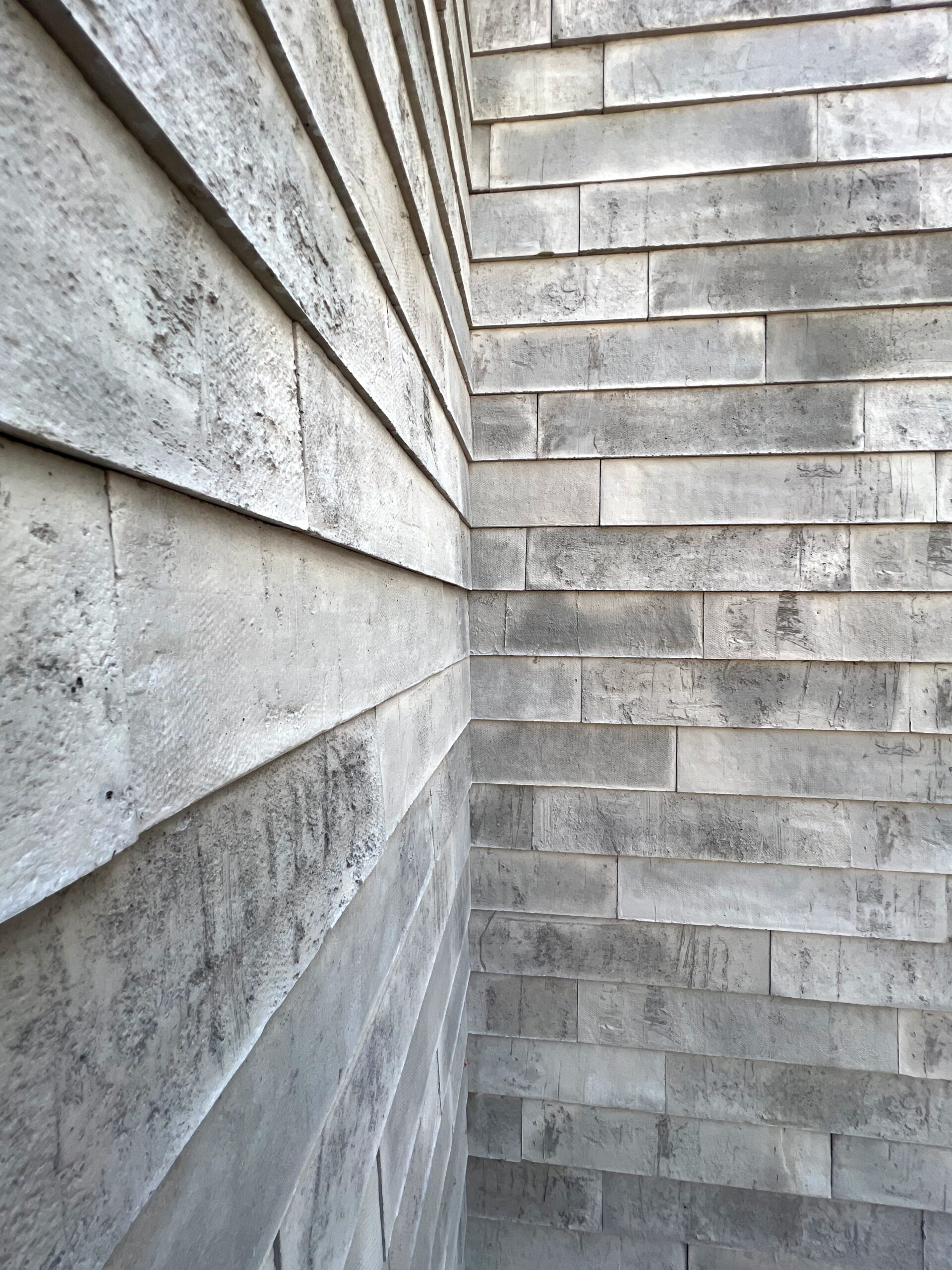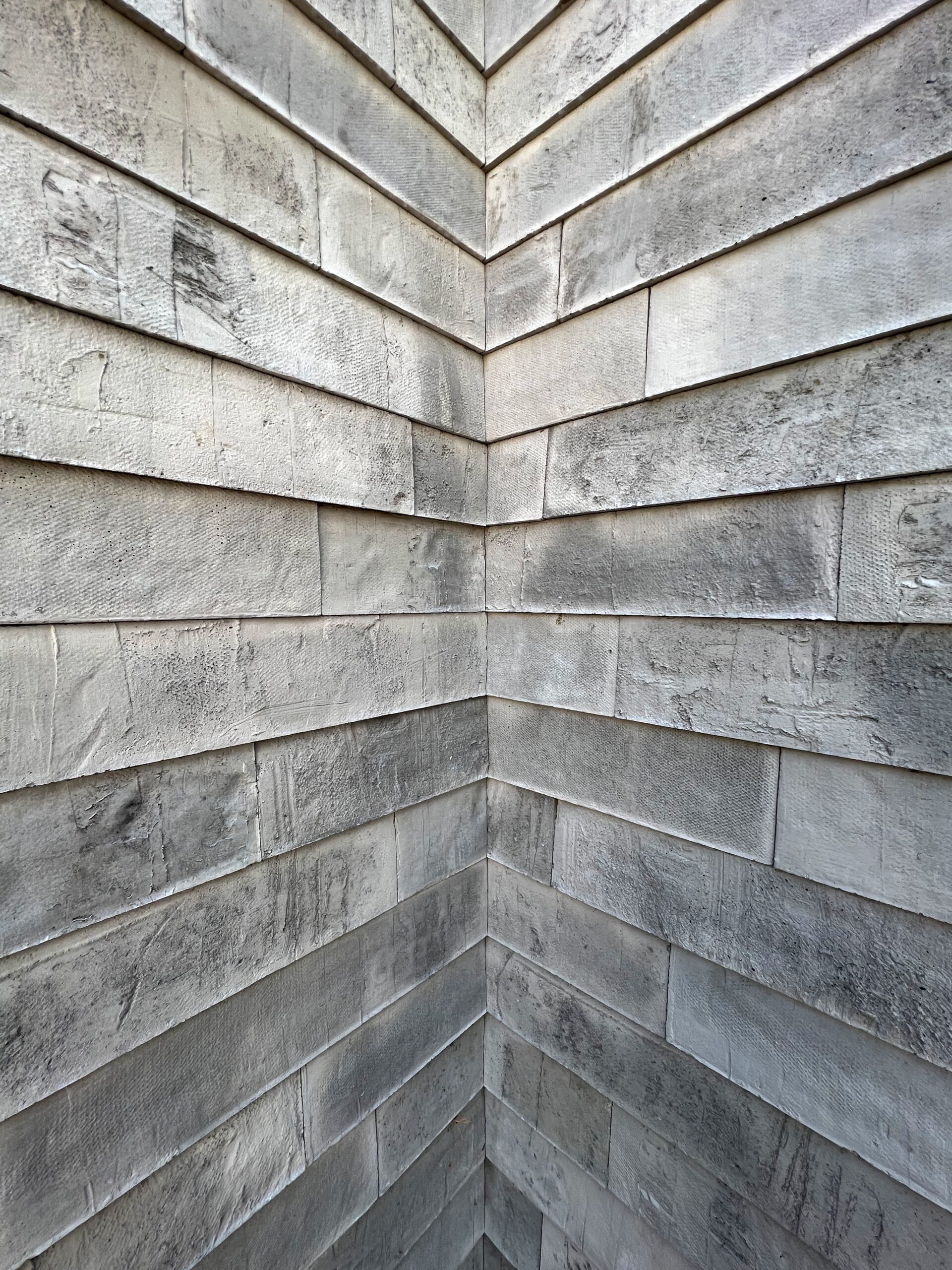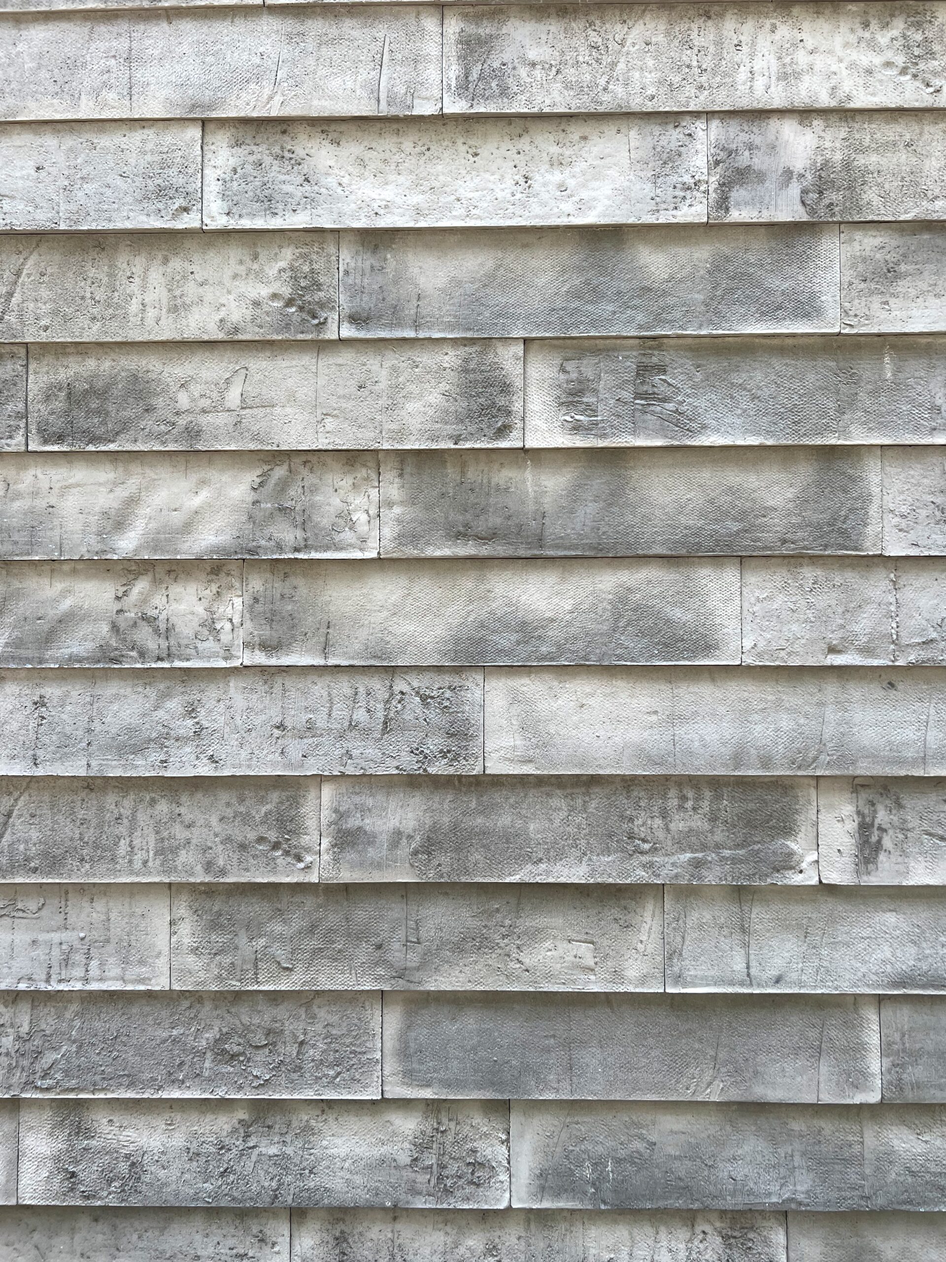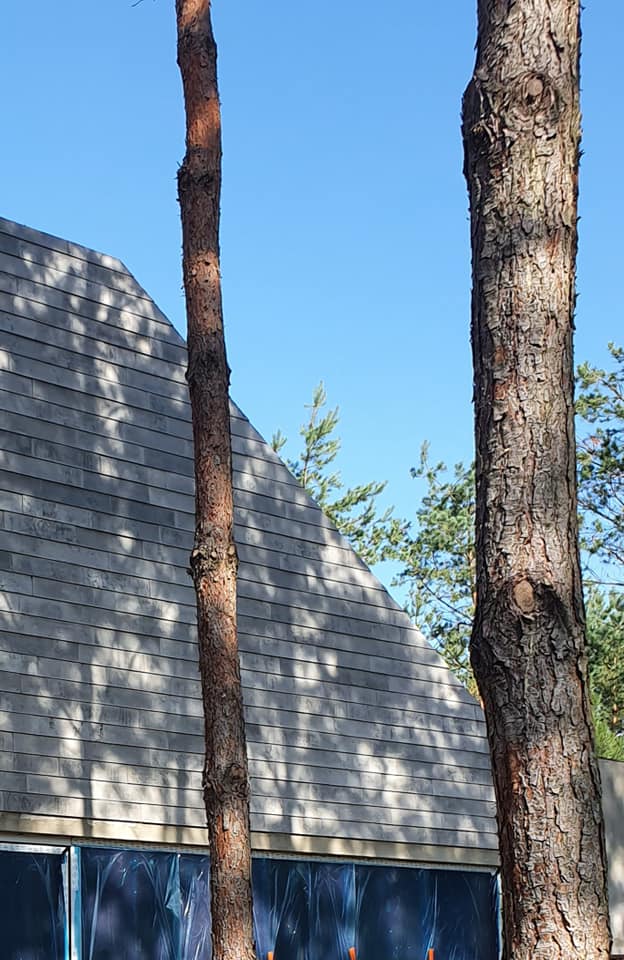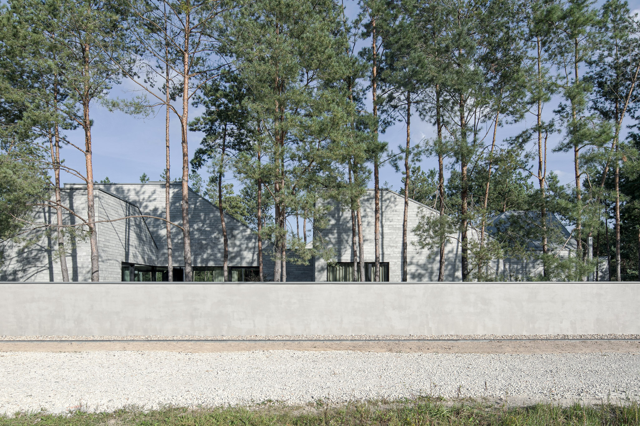 Niemal wszystkie ściany zostały obłożone specjalnie zaprojektowaną do tego domu płytka betonową: jej różnorodna i chropowata forma została ułożona niczym łuski nachodzące jedna na drugą. Z jednej strony chronią elewacje przed szybkim niszczeniem w leśnym klimacie a z drugiej są pięknym tłem do gry cień padających z pobliskich drzew.