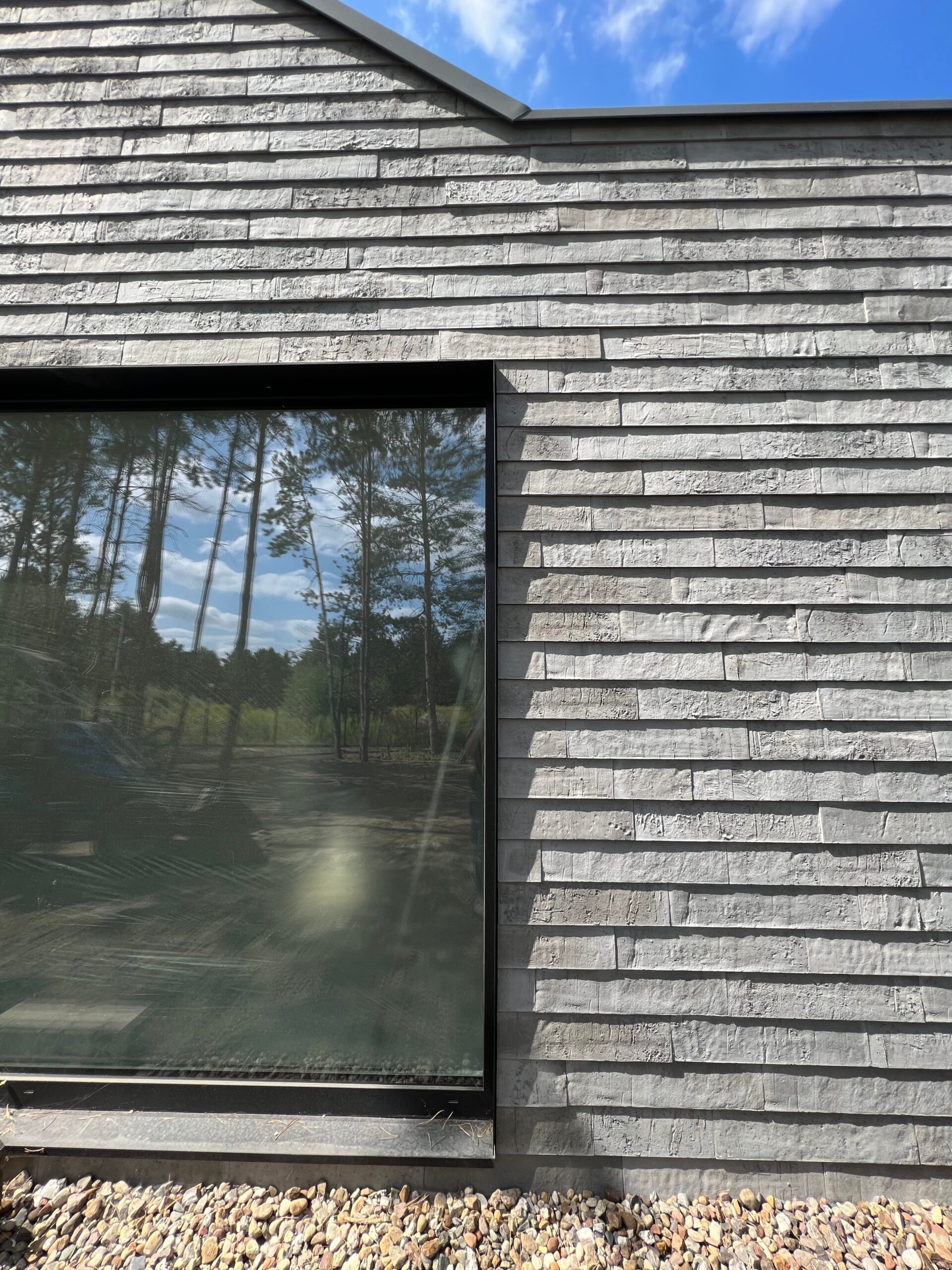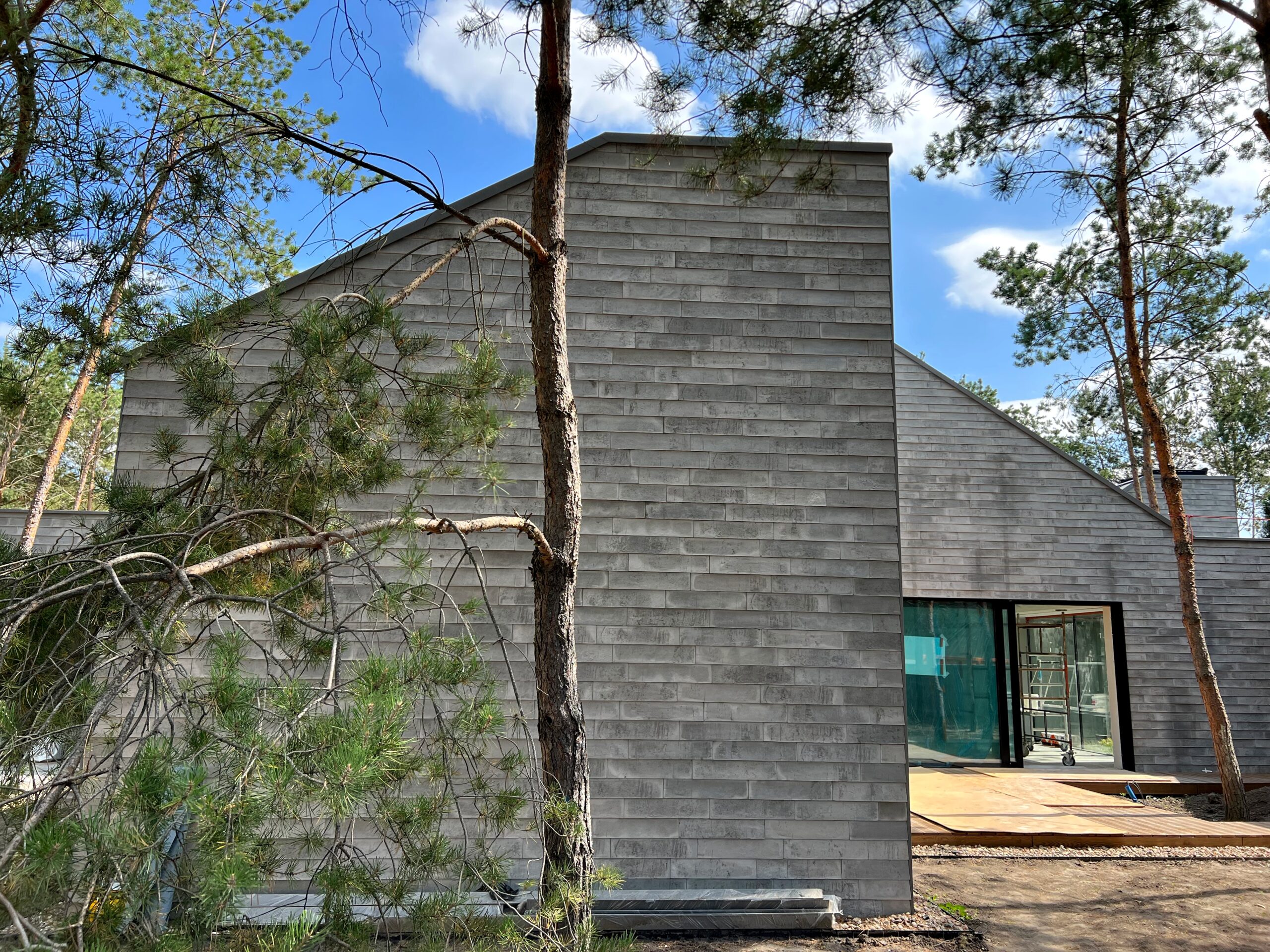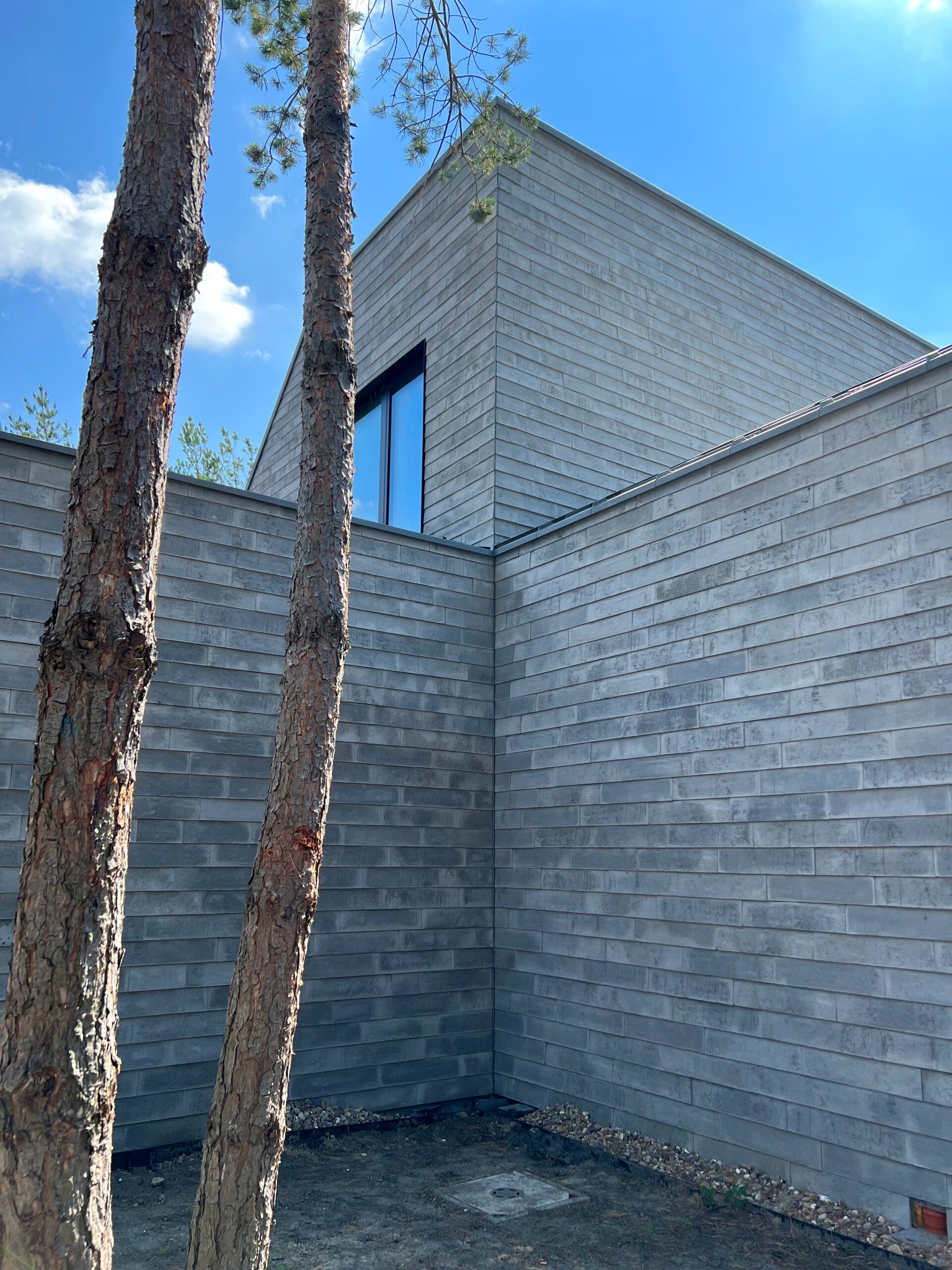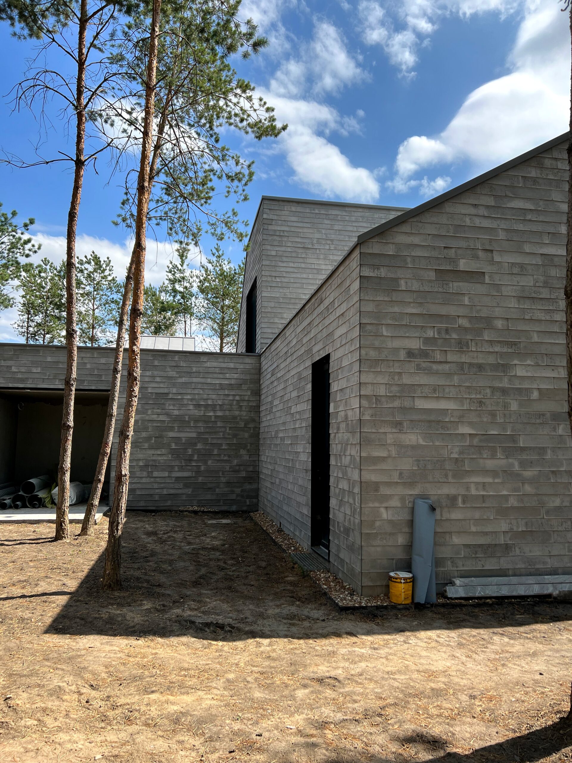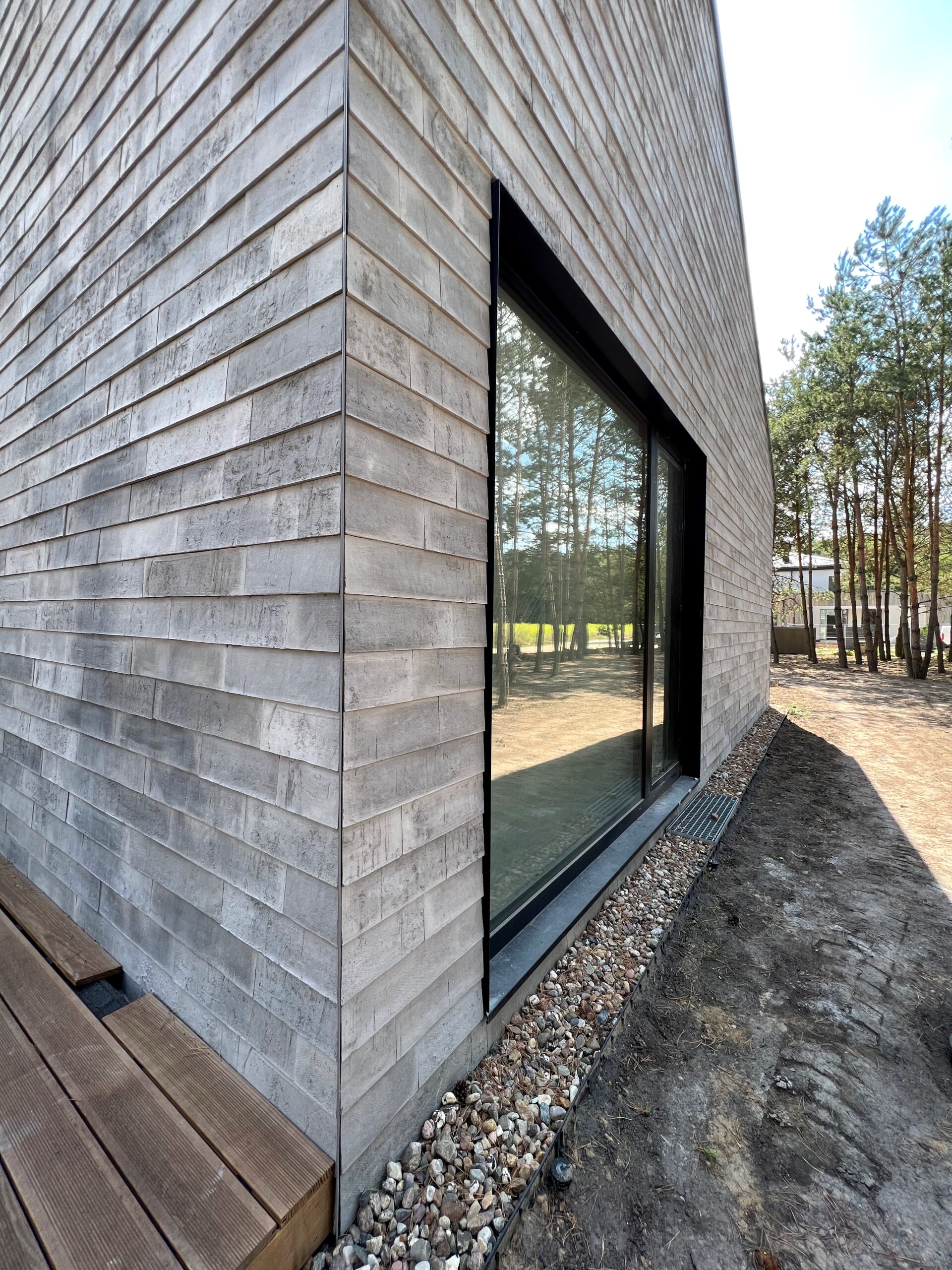 Mówimy tu i patrzymy na elewację, gdzie główną rolę gra kafel SEMIROOFO. Do tej pory taki efekt wizualny osiągany był przy konieczności wykonywania fasad wentylowanych. Teraz otrzymujemy go metodą klejenia! Ten pomysł zdecydowanie wpływa na łatwość montażu, jak i obniżenie kosztów budowy!