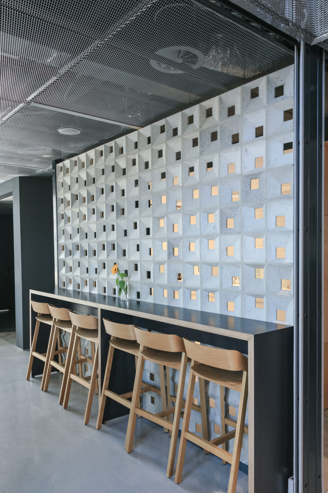 Ściana dzieląca przestrzeń w części jadalnej kantyny, dla pracowników Centrum Innowacji Fabryki Maszyn w Radomiu.