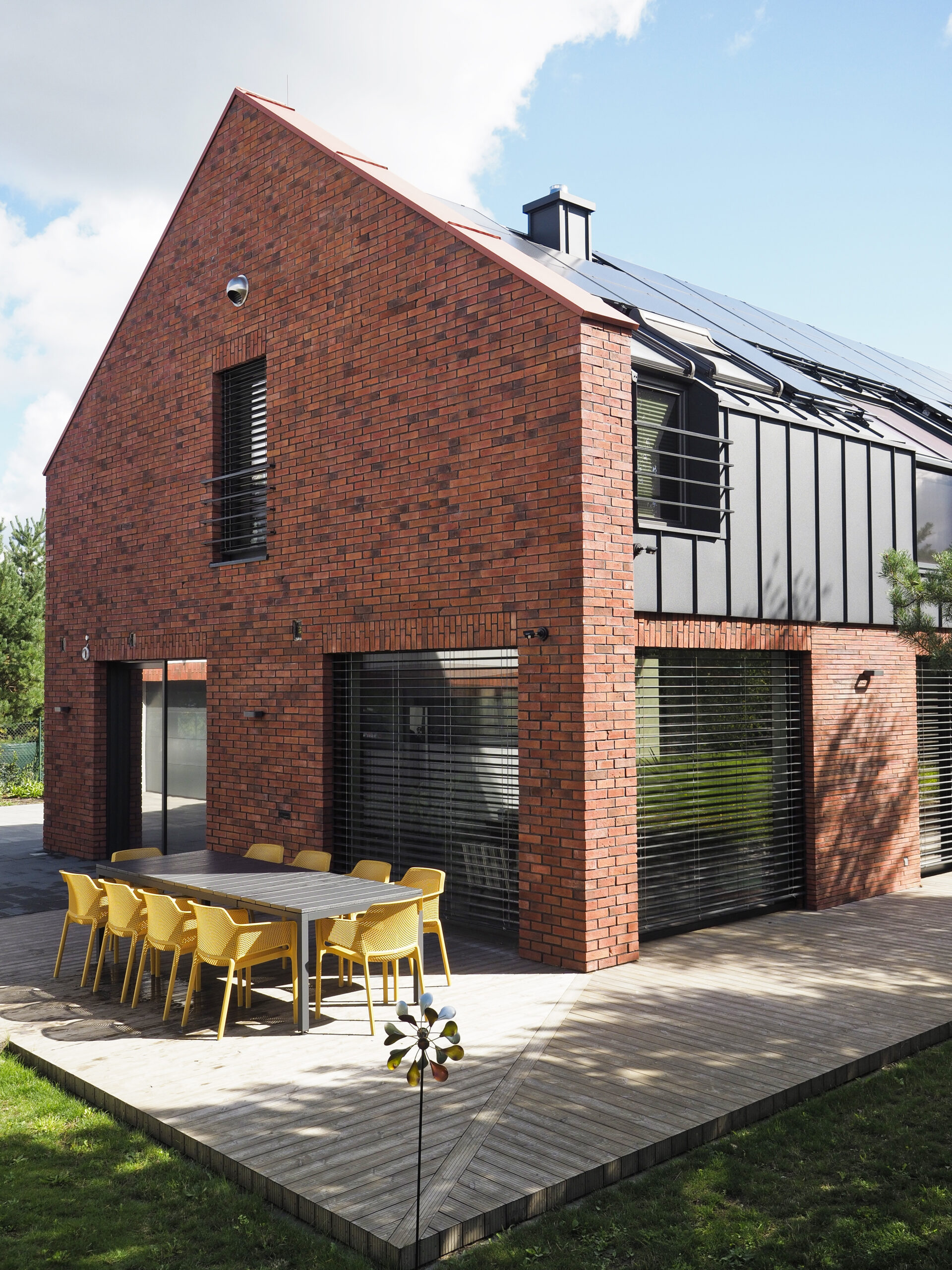 Gdzie ją zastaliśmy? Na drabinie oczywiście, a żeby było jeszcze ciekawiej, to drabina była na dachu, gdzie Dorota realizowała ostatnie prace wykończeniowe – elektryczne, bo elewację zamontowali z mężem już wcześniej. Do wykończenia potężnej bryły w stylu nowoczesnej stodoły wybrali płytki LONG i Nową Cegłę w kolorze naturalnym – idealne połączenie dla projektu, który łączy w sobie tradycję i nowoczesność.