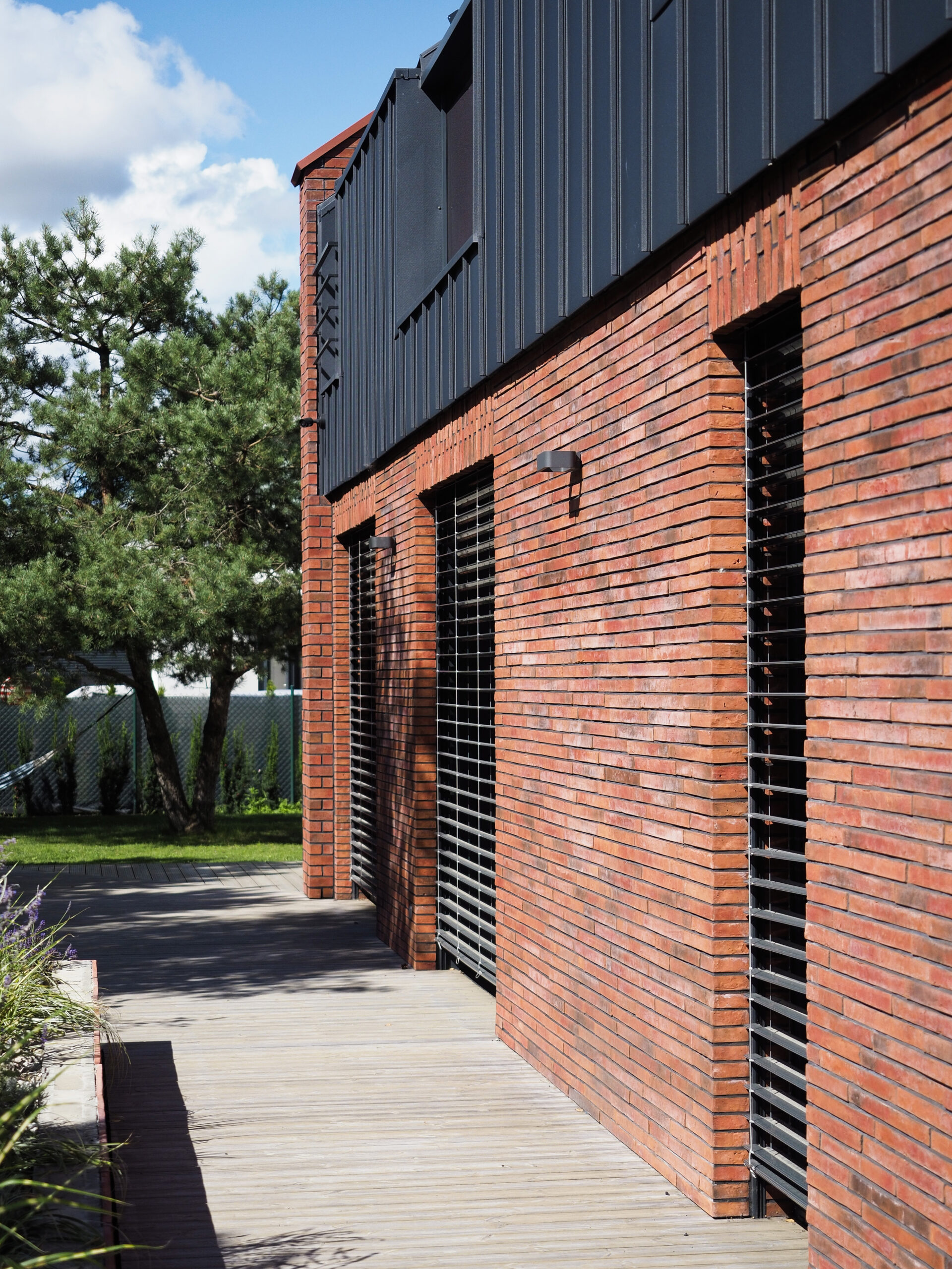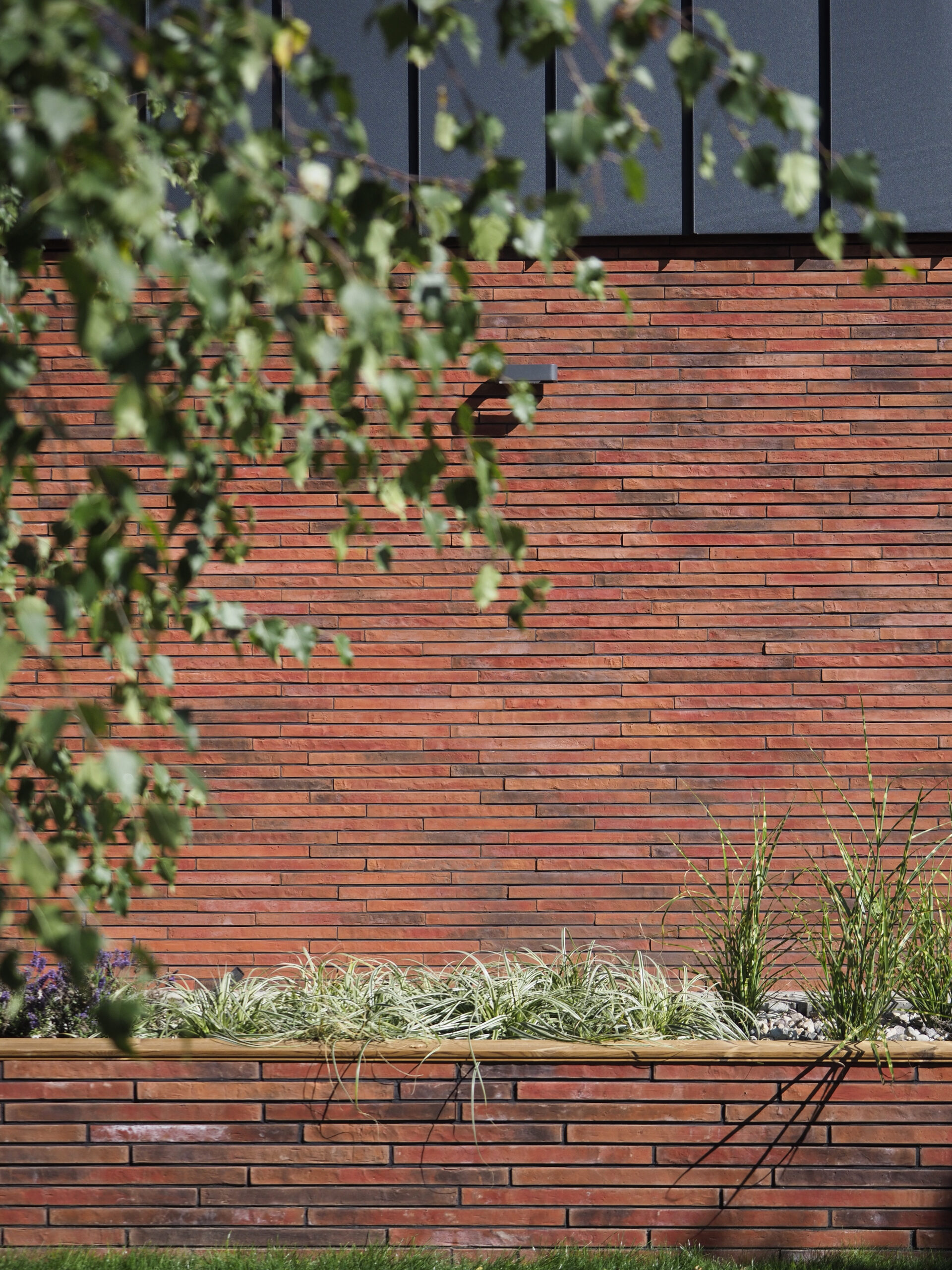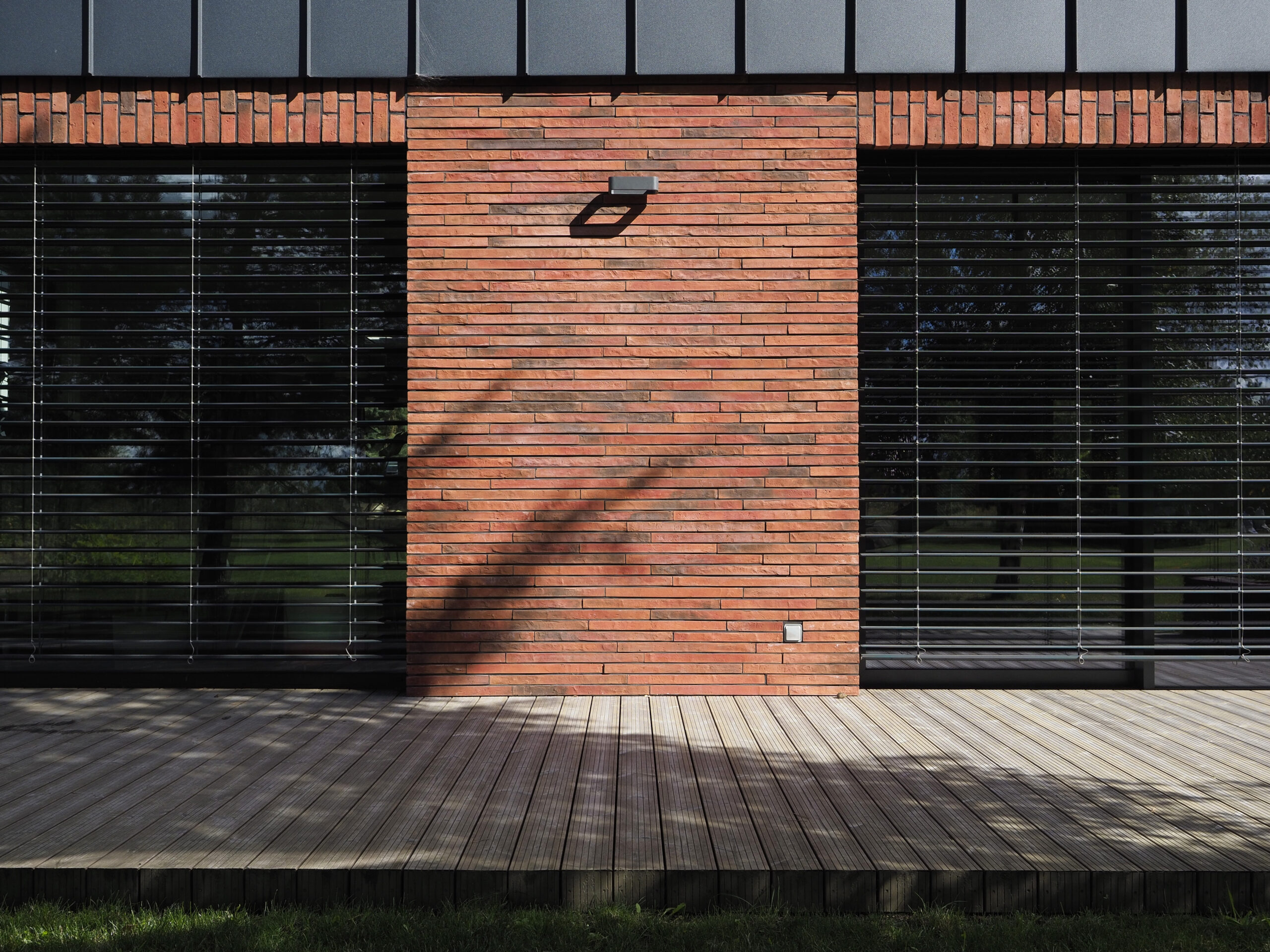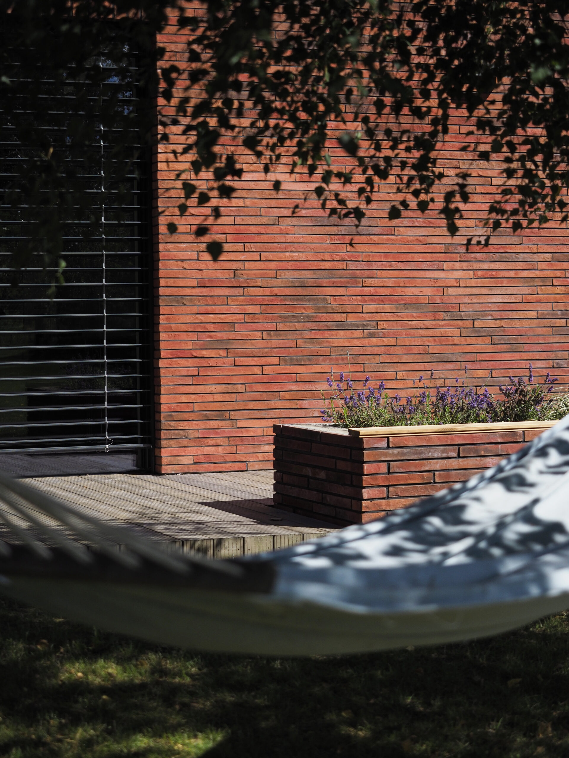 Z ciekawostek – płytki LONG posłużyły tu także do wykończenia elementu małej architektury, czyli długiej donicy wpisanej w drewniany taras. Rosnące w niej trawy pięknie kontrastują kolorystycznie z ciepłym odcieniem elewacji.