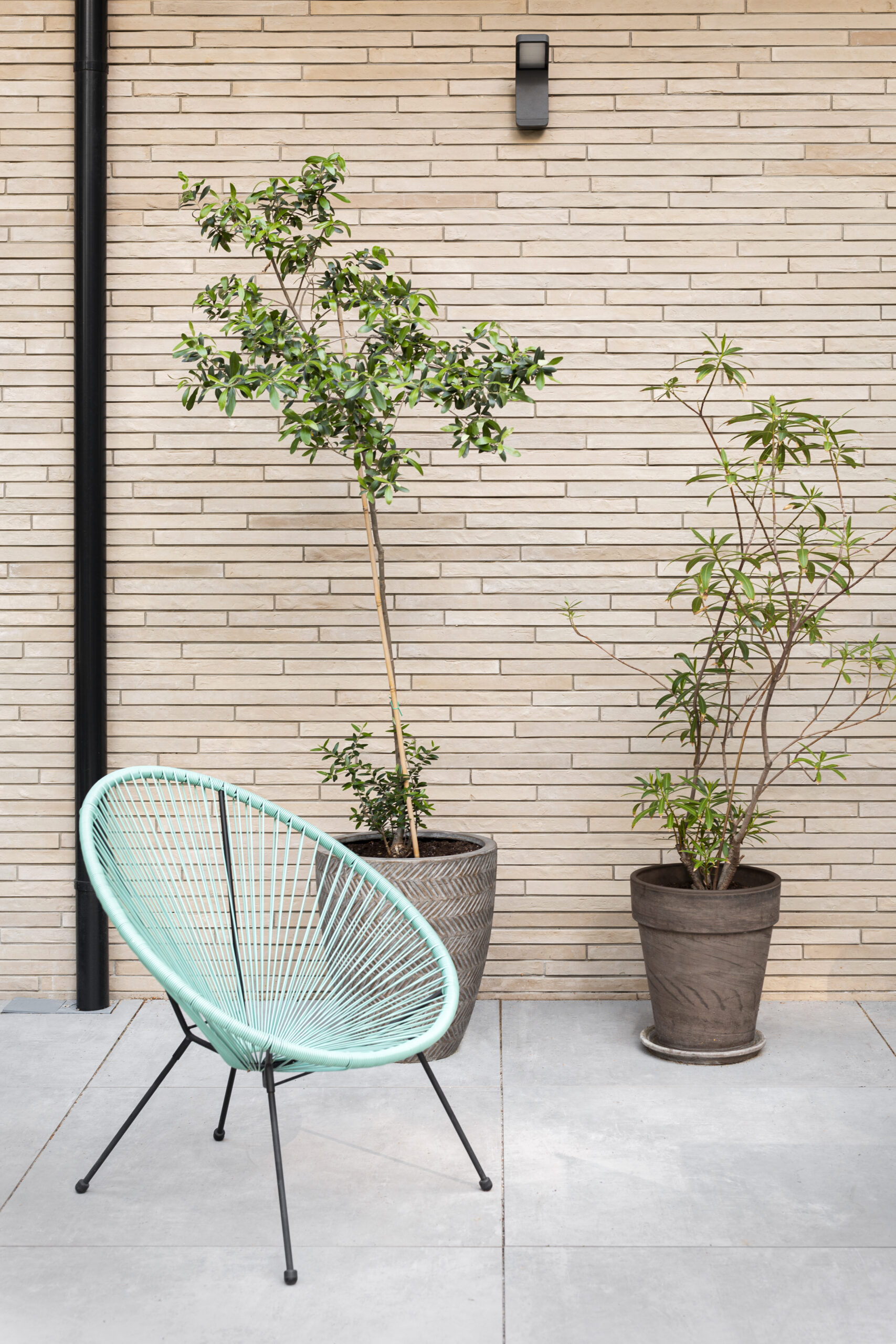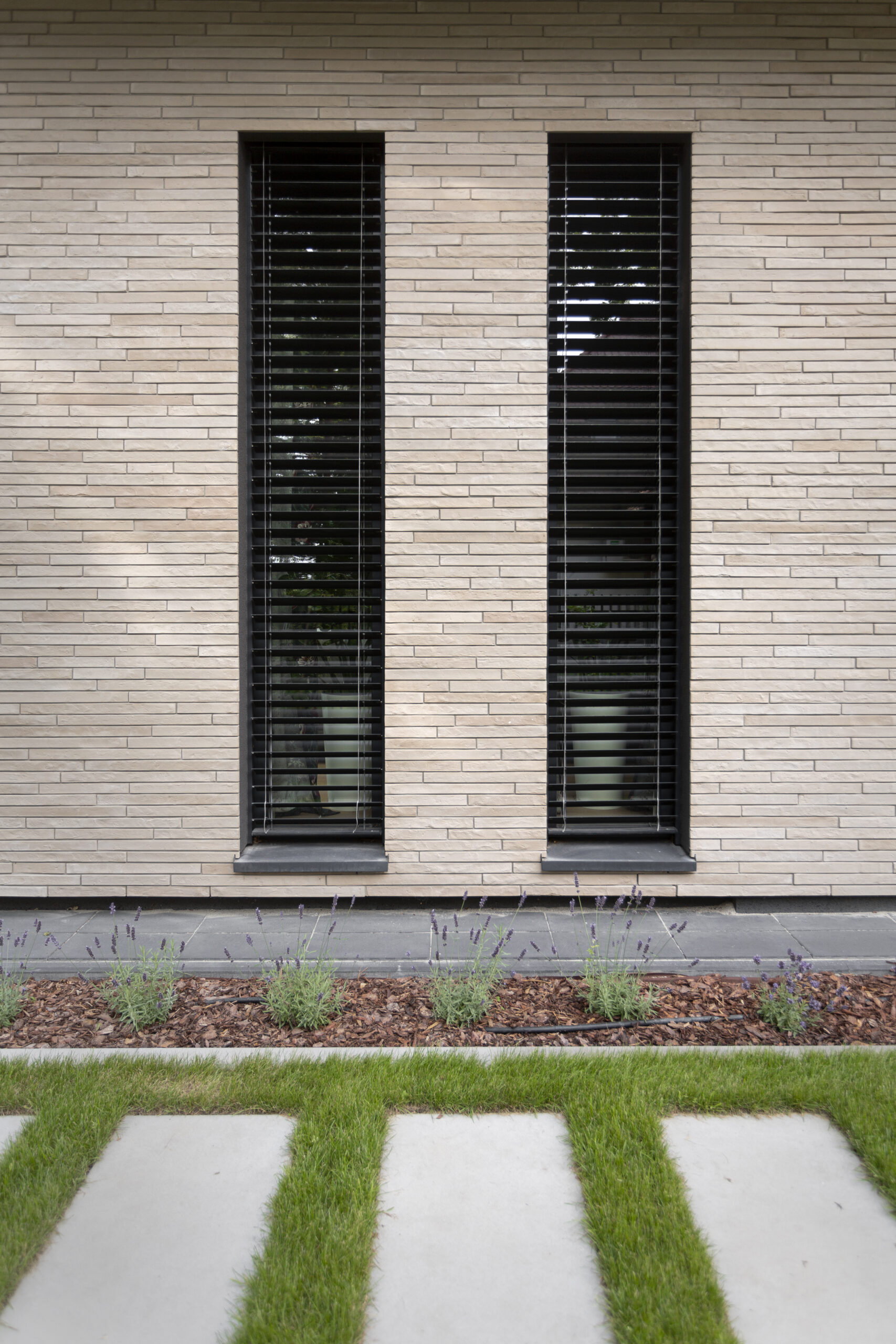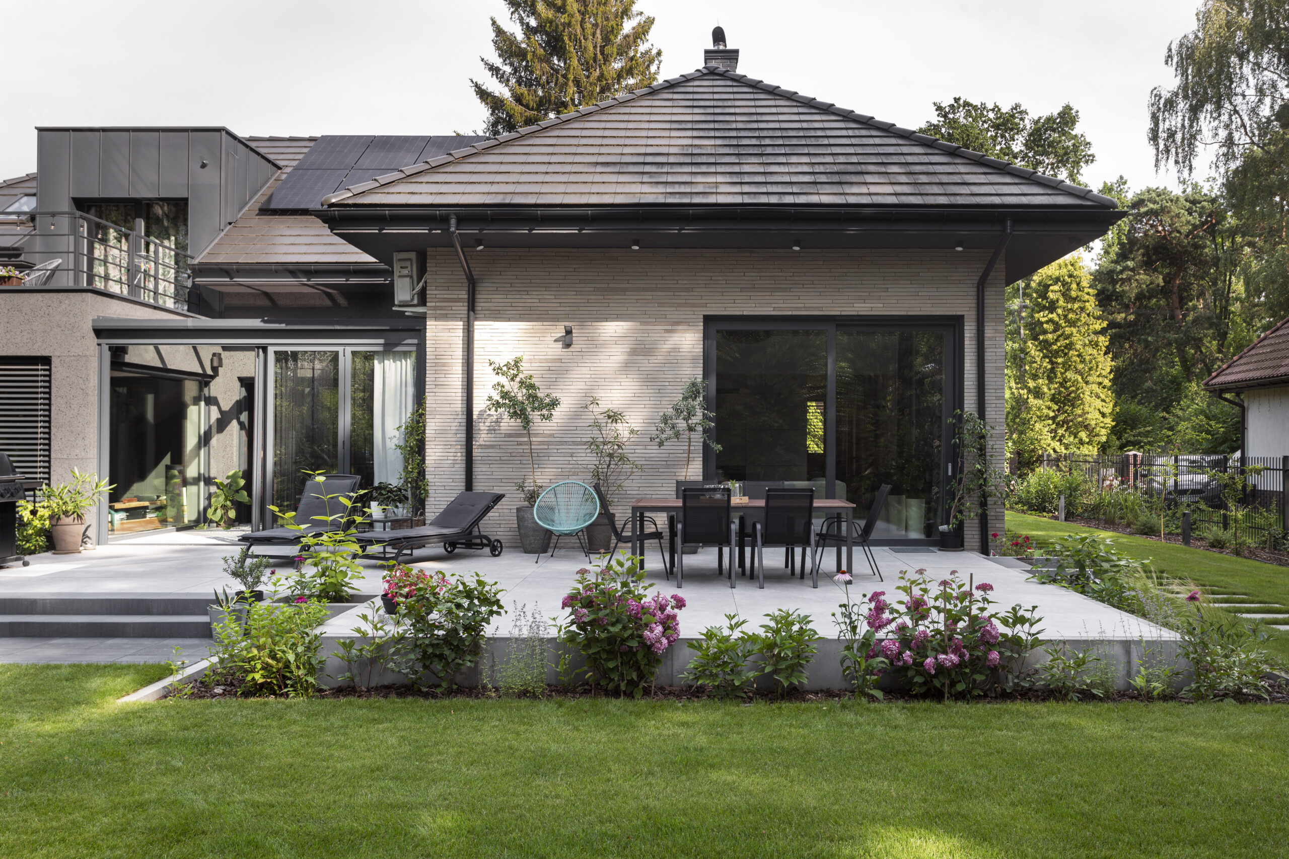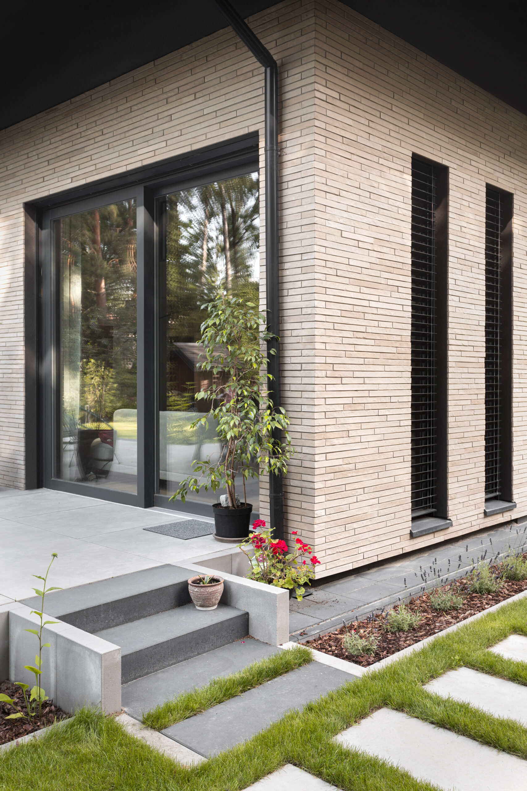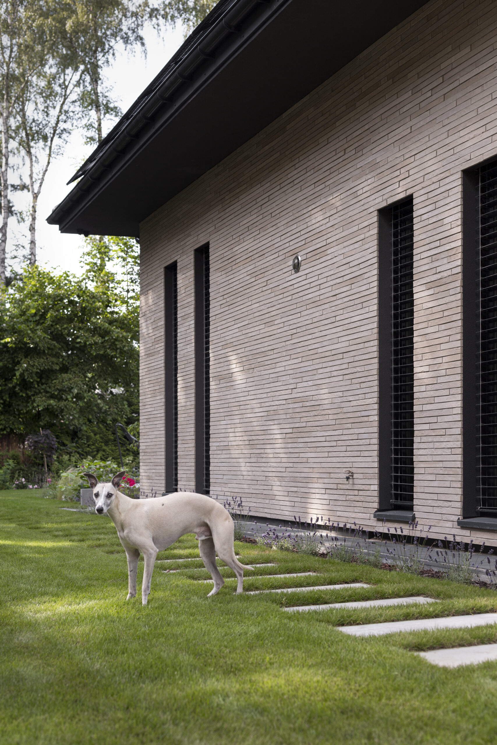 Na pewno w elegancji – niewymuszonej, takiej “wakacyjnej”. Zestawienie beżu i grafitowych elementów wykończeniowych, niegdyś szokujące, dziś należy już do kanonu. Inwestorzy zdecydowali się na odważny zabieg, polegający na wizualnym podziale bryły domu na dwie części – jedną obłożoną naszymi cegiełkami i drugą, gładko wykończoną kontrastowym, ciemnym tynkiem. W ten sposób bryła nabrała dynamiki, a poziome ułożenie płytek zarówno na elewacji, jak i ogrodzeniu sprawiło, że całość wydaje się mocno rozciągnięta horyzontalnie. Rozłożysta, zupełnie jak śródziemnomorskie wille.