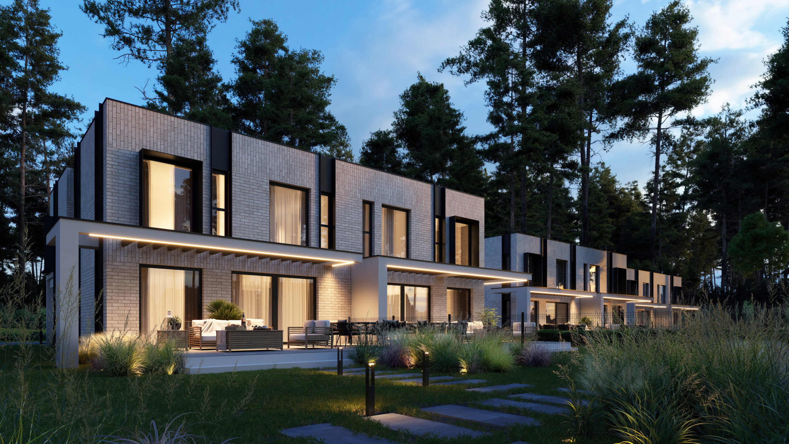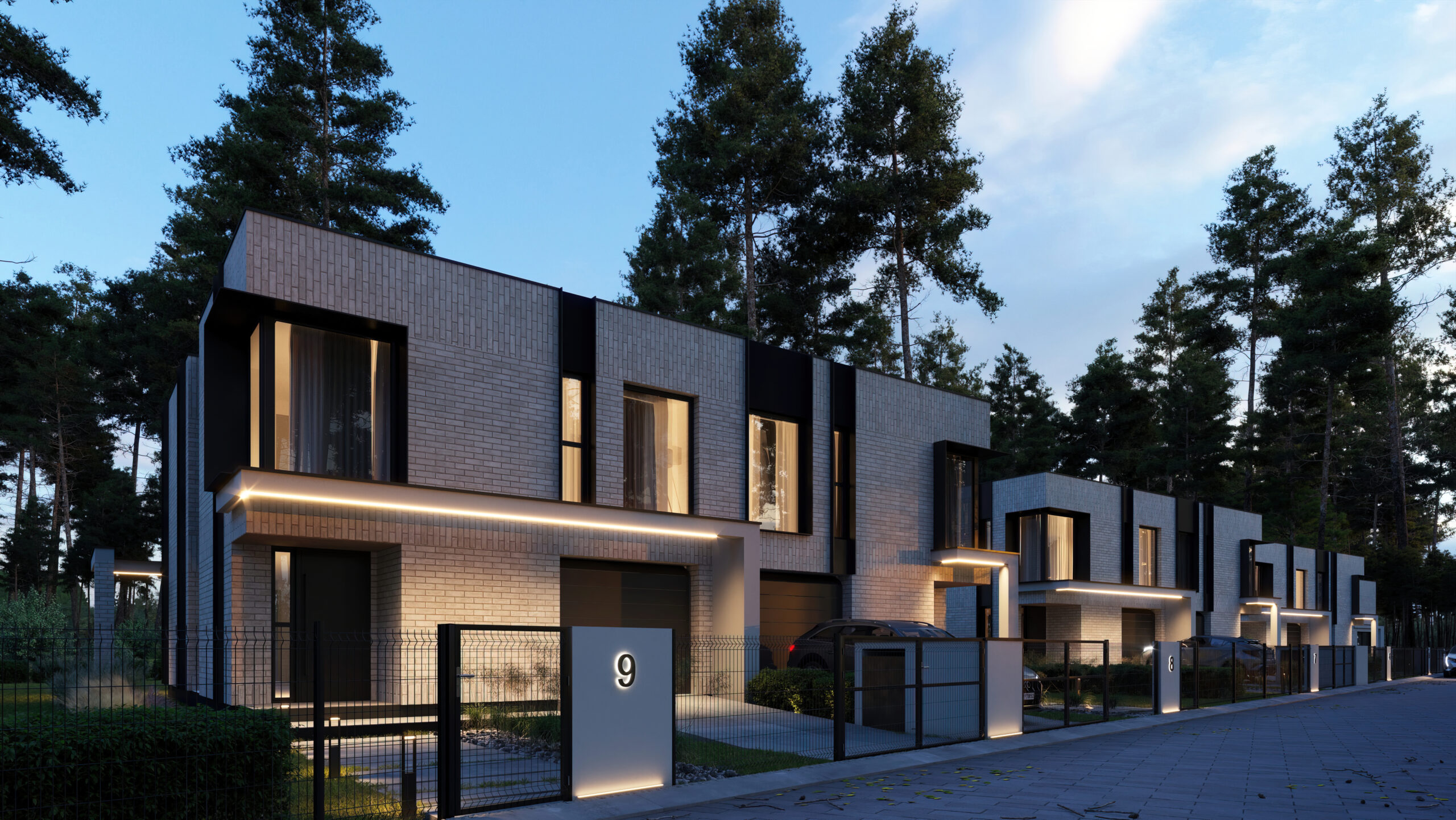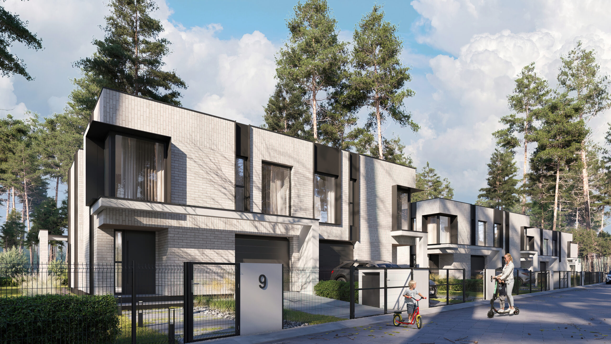 “(…) Projekt osiedla ze względu na bliskość komunikacyjną ze stolicą miał nawiązywać do miejskiej klasycznej zabudowy. Wykończenie w postaci płytek ceglanych poprzez różnorodne ułożenie (pion – poziom) urozmaica bryłę, a wystające ramy okienne korespondują swoją smukłością z otaczającymi sosnami.”
