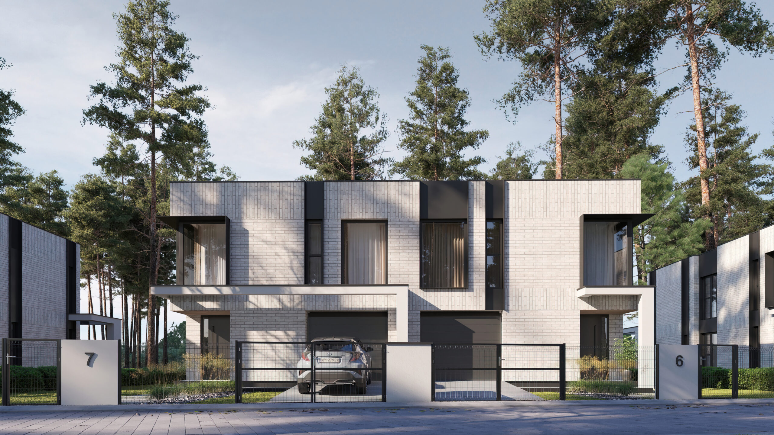 „(…) Elewacja frontowa niewielkiej „szeregówki” miała być harmonijna, prosta, ale z wysmakowanym detalem. Podobnie bryła budynków w zabudowie bliźniaczej: elegancka, przywołująca na myśl budynki z okresu modernizmu, ale tutaj naznaczona współczesnością poprzez ułożenie cegieł czy wystające z lica elewacji szpalety wokół okien wykonane z blachy w ciemnym kolorze grafitowo – czarnym.”