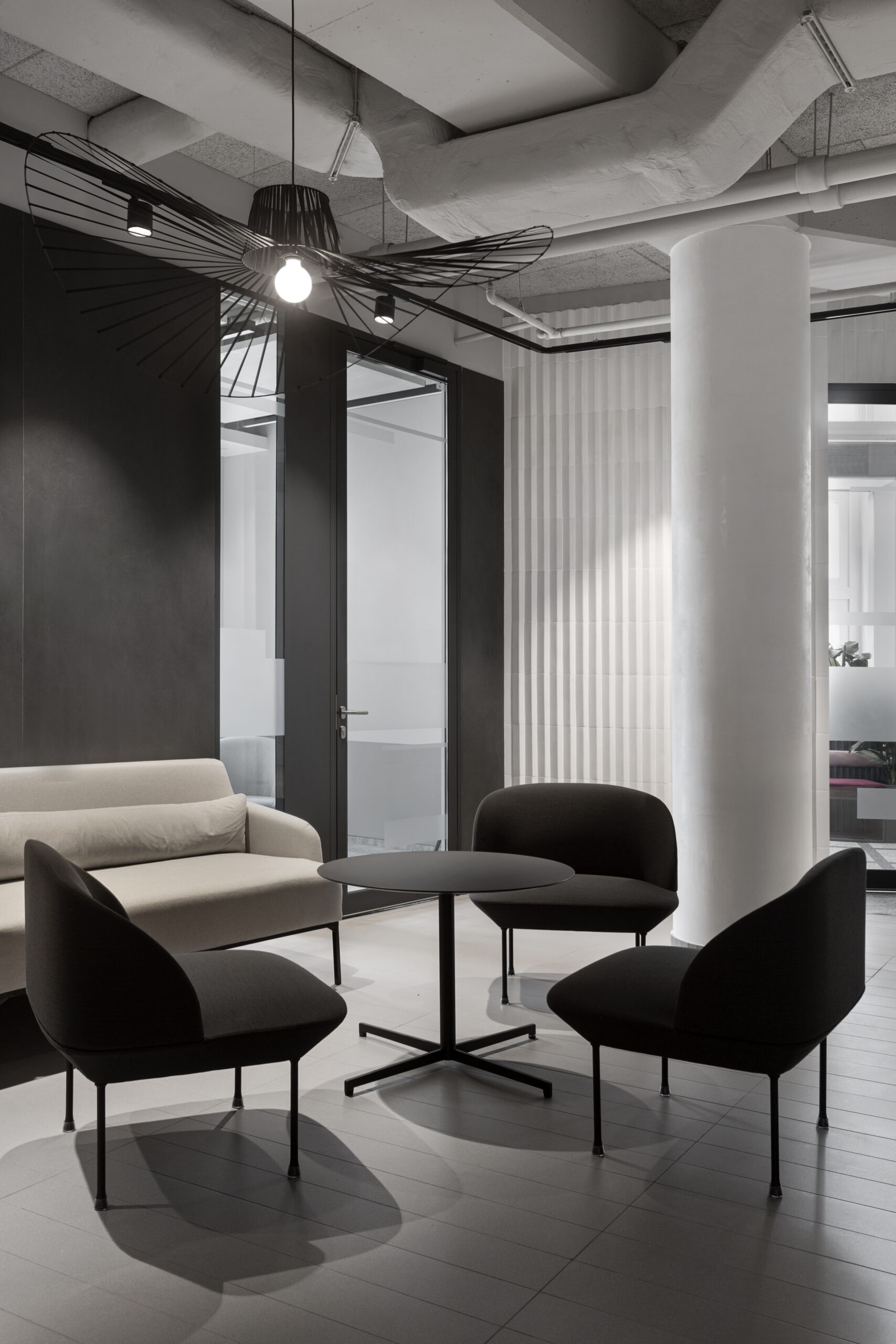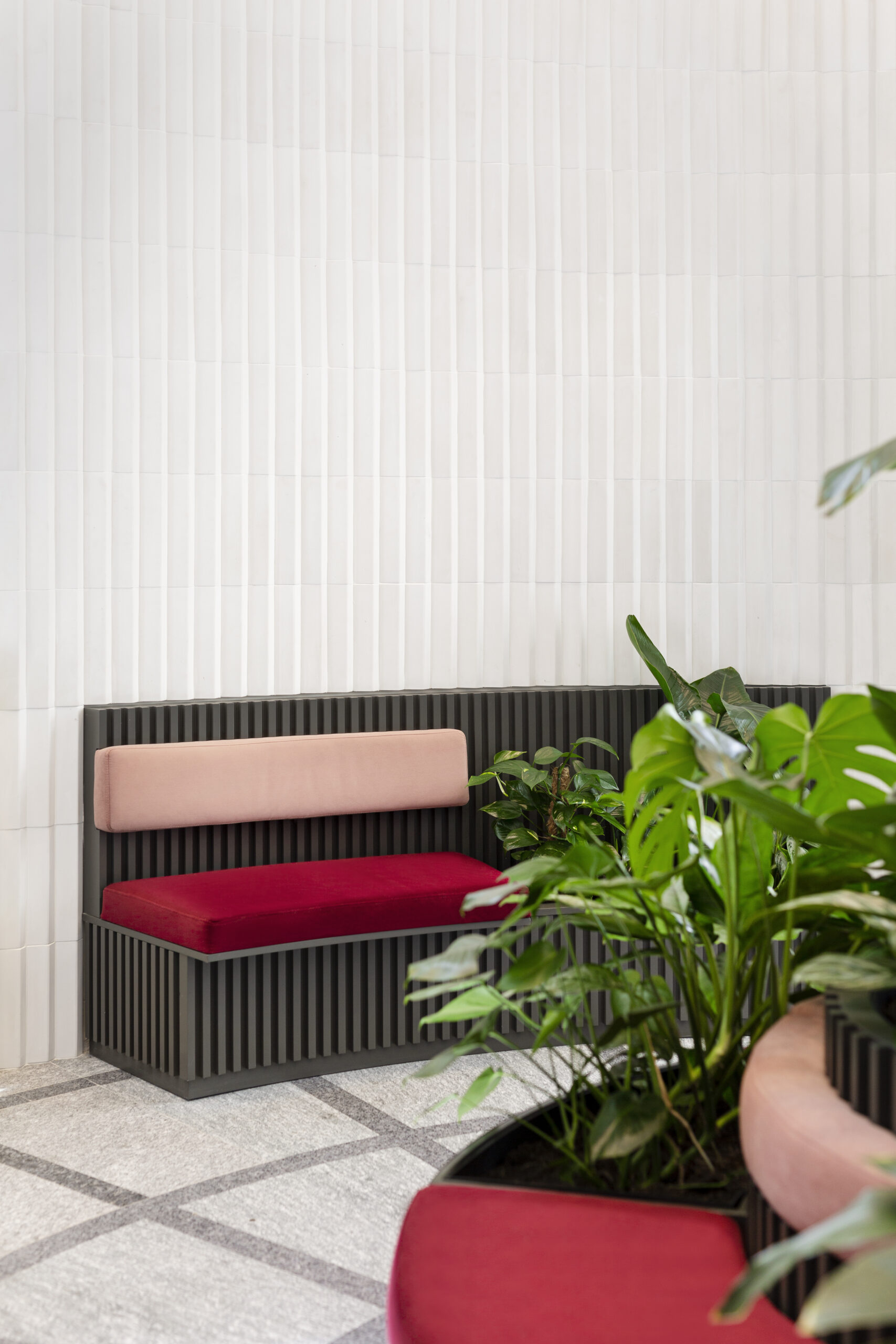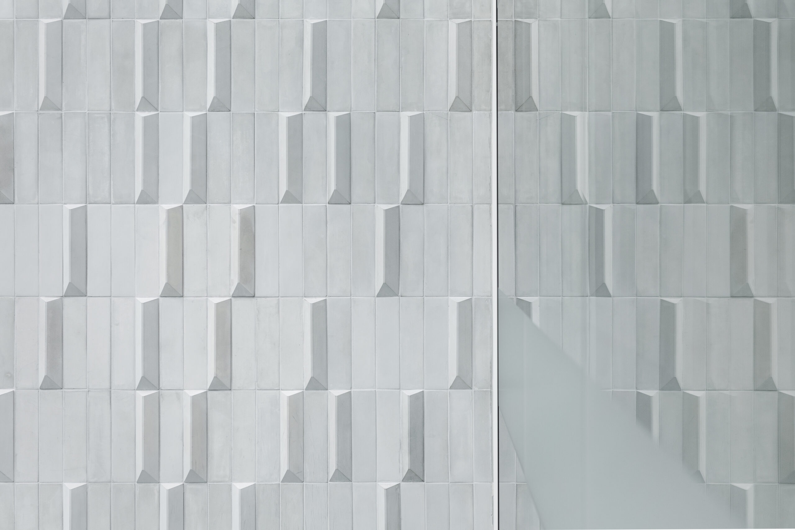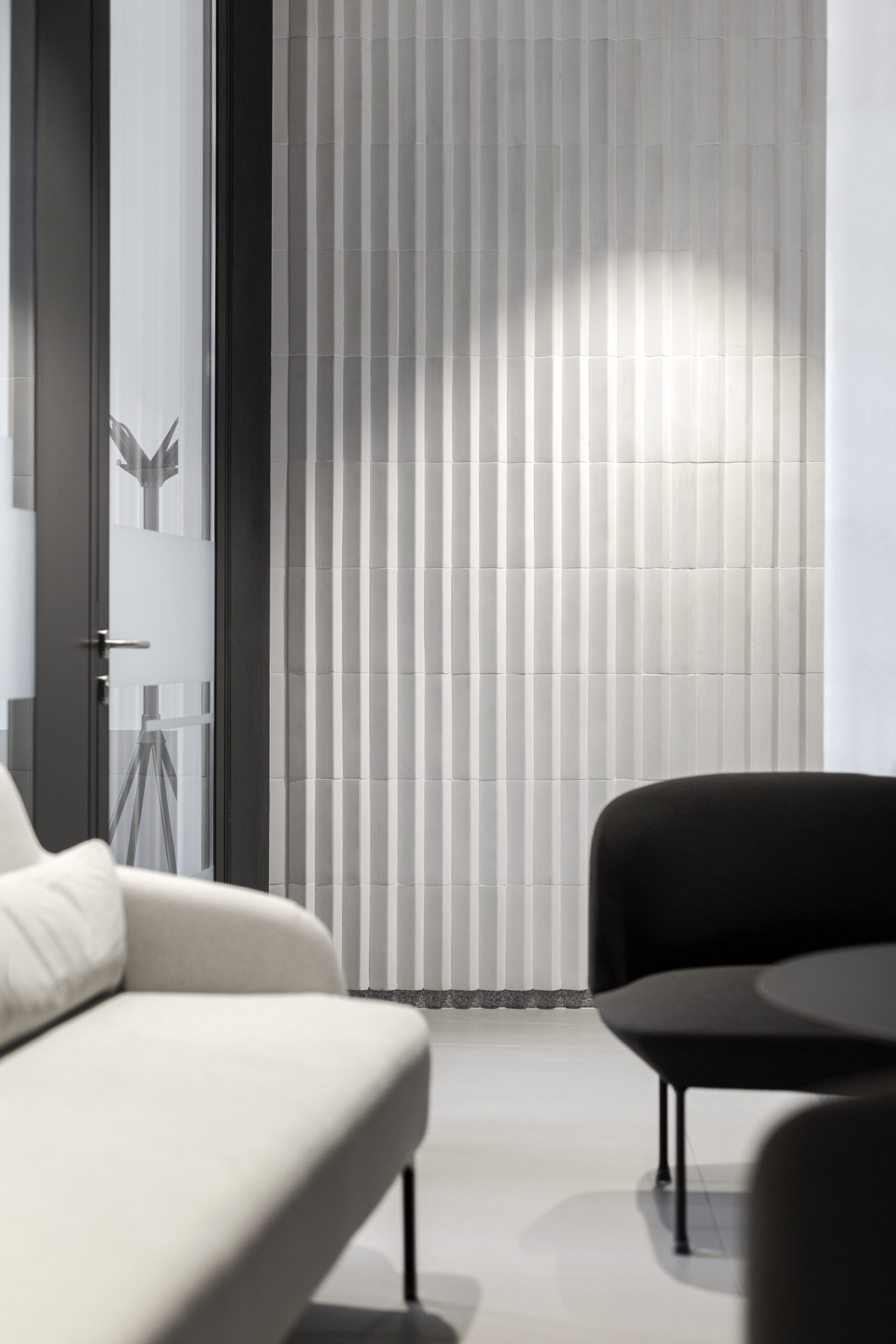 Podłużne, smukłe formy wyznaczają rytm i wprowadzają dynamikę do oszczędnych, minimalistycznych wnętrz. Po raz pierwszy możemy się na nie natknąć w lobby budynku, na parterze, gdzie przełamują geometrię ścian w kąciku wypoczynkowym. Odpowiednio podświetlone przypominają delikatne formy origami i aż proszą się o dotyk. Tu mamy kafle PLANK 1.