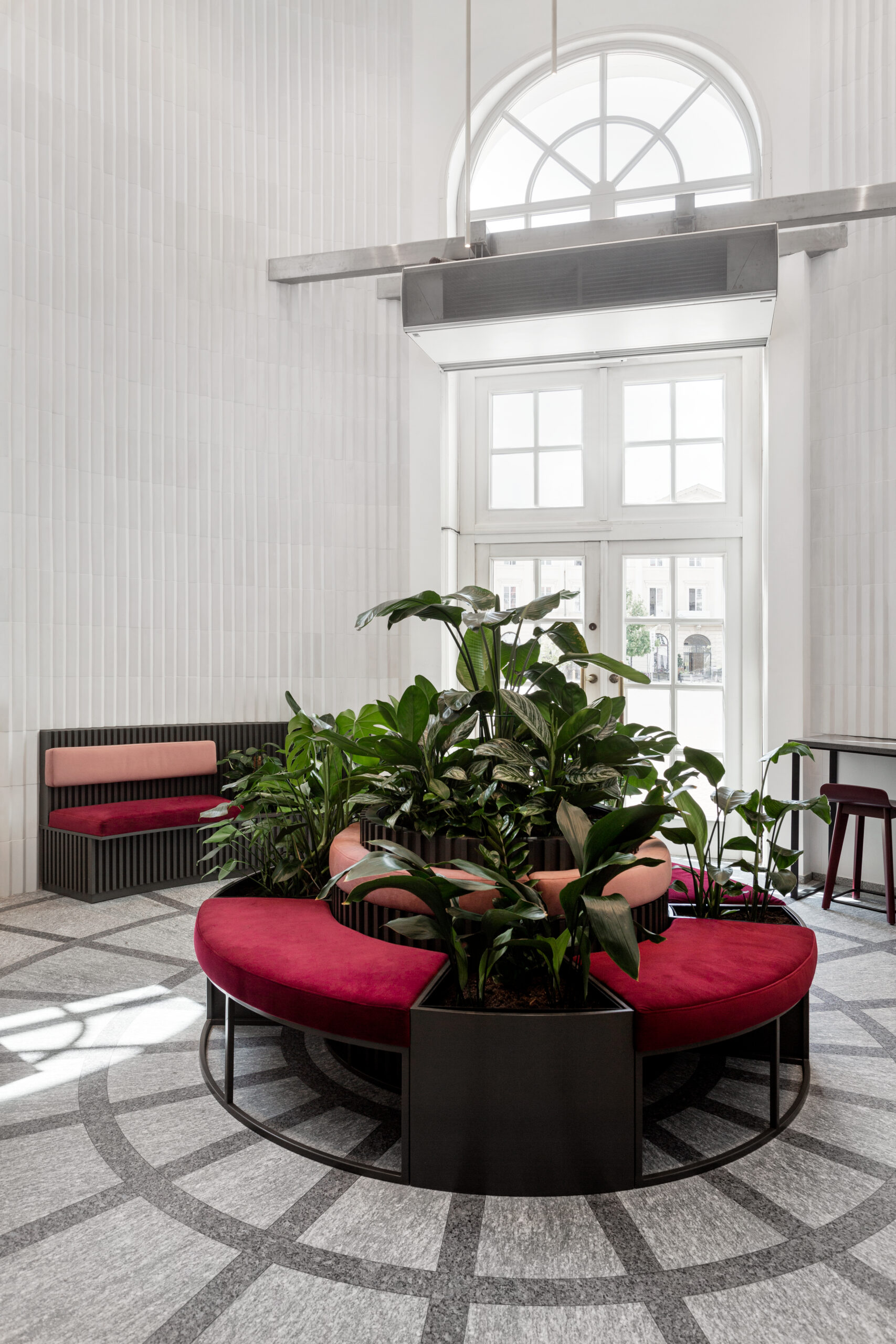 Kilka kroków dalej znajdziemy kawiarnię urządzoną w starym, okrągłym holu. W tym wysokim na kilka pięter, doświetlonym olbrzymimi oknami pomieszczeniu również królują TEKTy, ułożone aż pod sam sufit. Pijąc kawę warto zadrzeć głowę do góry – ściany ozdobione PLANK 1 i naszpikowane oświetleniem sklepienie kojarzą się bardzo futurystycznie. Zwłaszcza, gdy za oknem mamy klasycyzujący gmach Teatru Wielkiego.