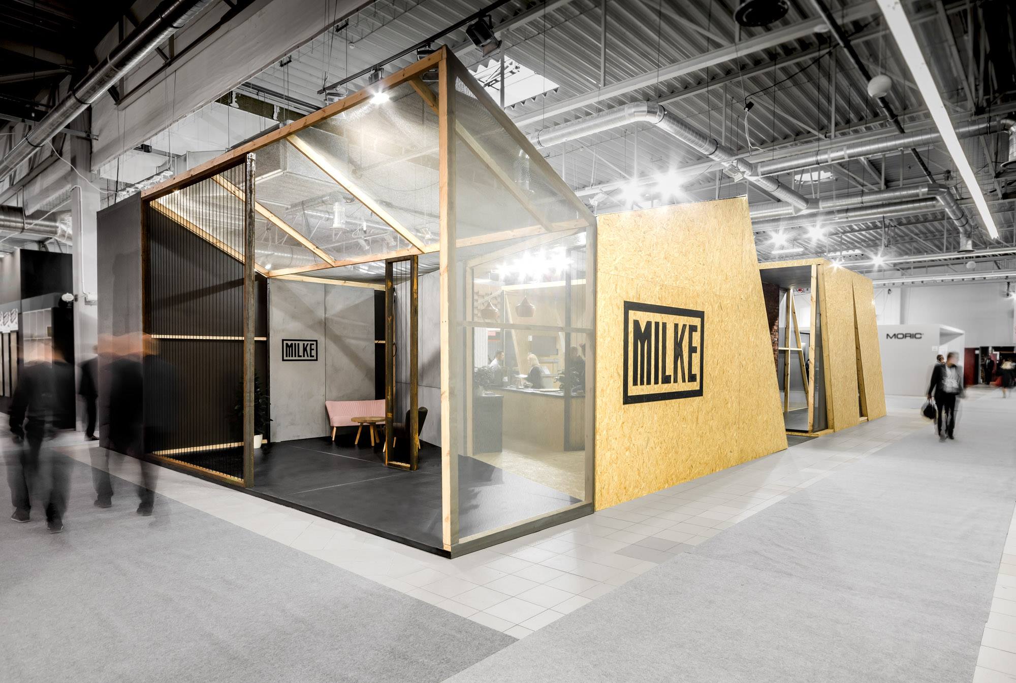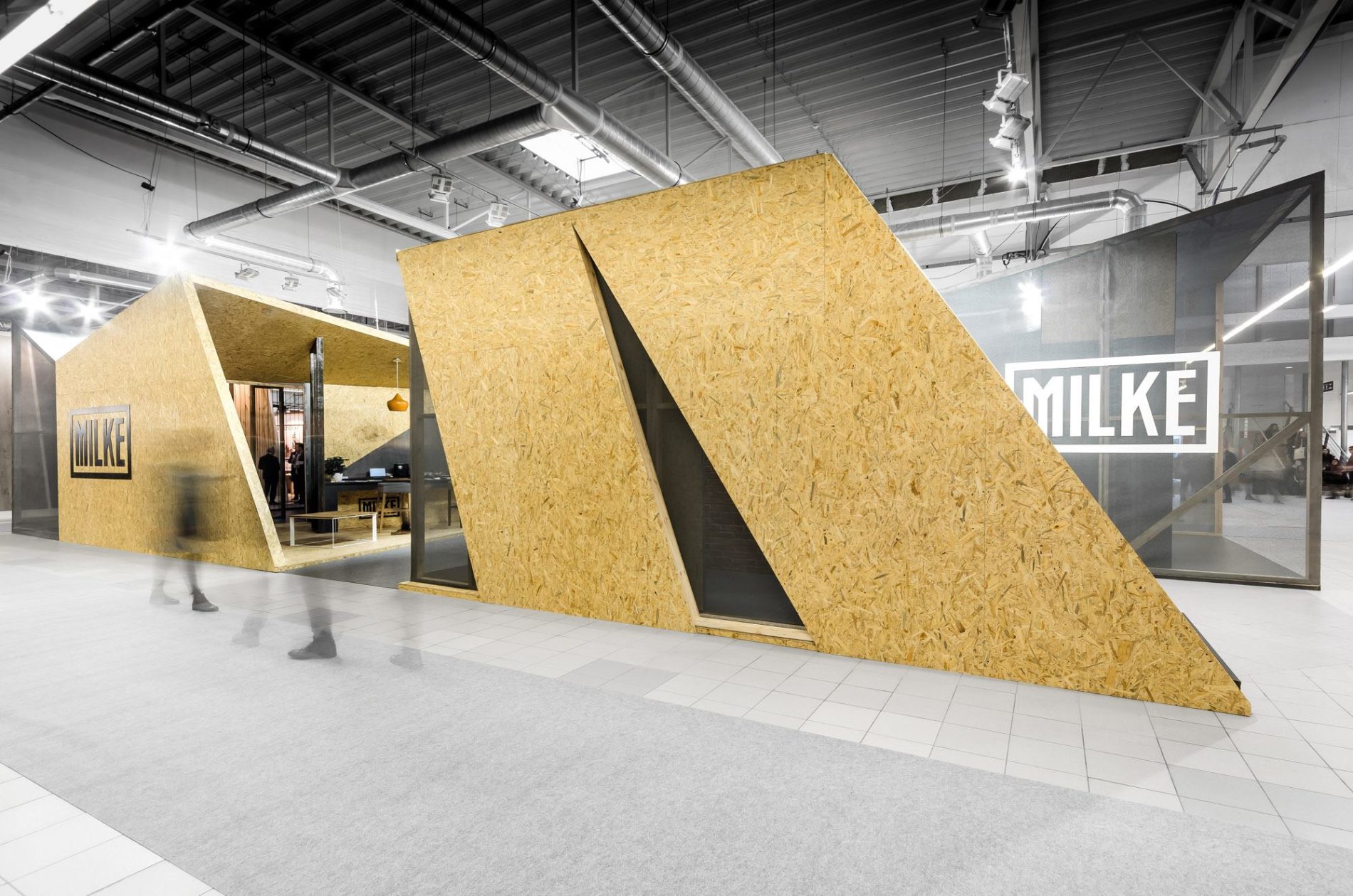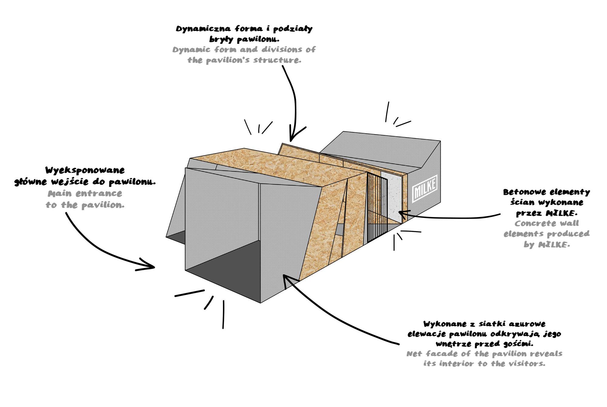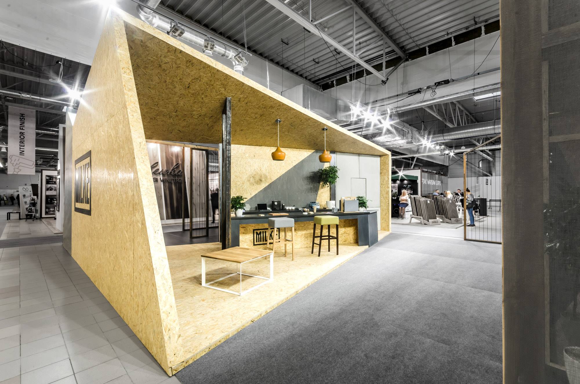 MILKE specjalizuje się w produkcji okładzin ściennych wewnętrznych i elewacyjnych z betonu architektonicznego w technologii GRC. Chcąc w pełni ukazać potencjał oferowanych przez MILKE produktów, projektanci z biura mode:lina™ wykorzystali sztandarowe rozwiązania marki jako element wykończenia ścian. Tym samym betonowe okładziny ścienne oprawiono w czarne ramy, na wzór logotypu oraz umieszczono na ścianach pawilonu nadając im kształty korespondujące z jego formą