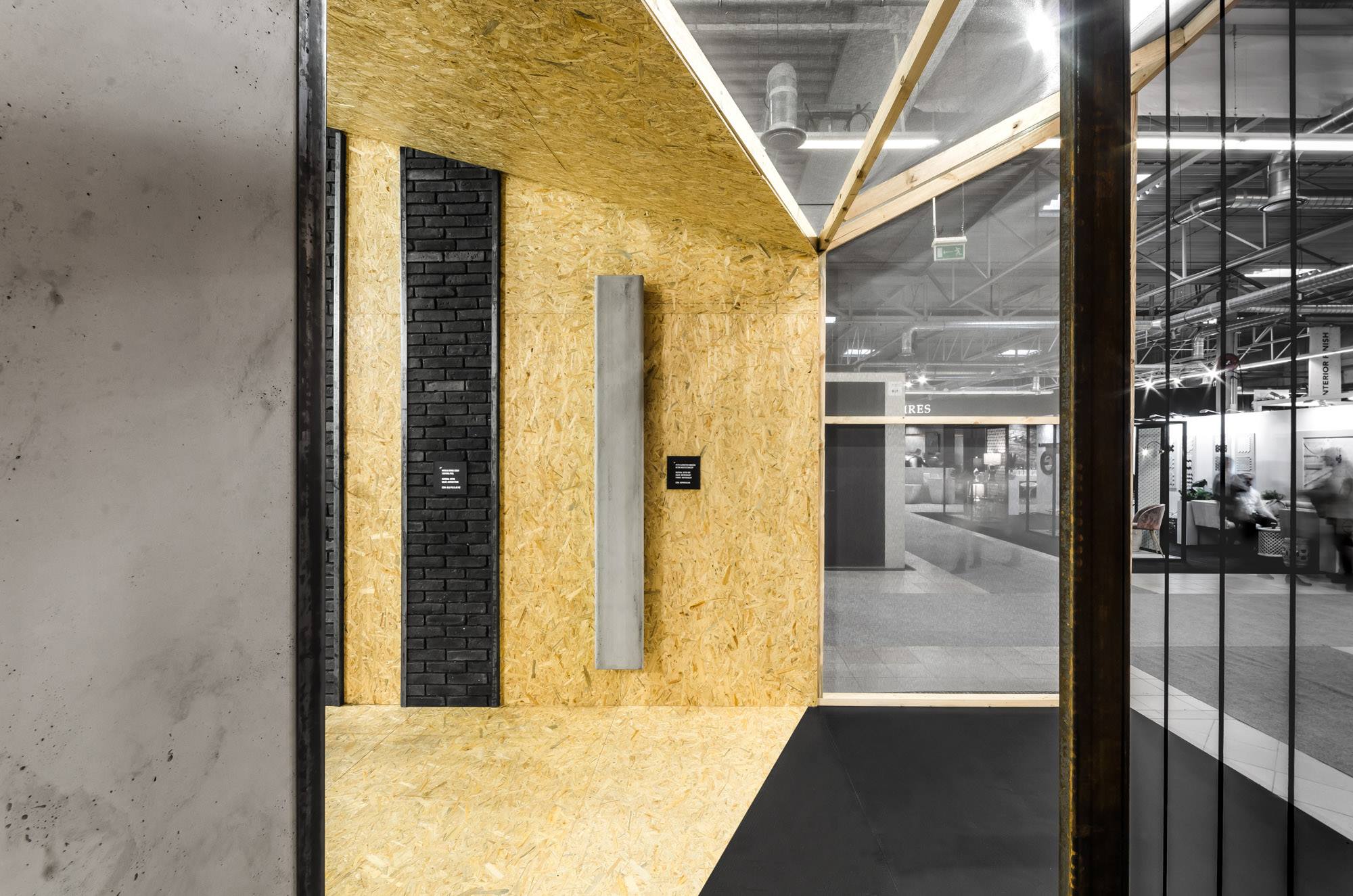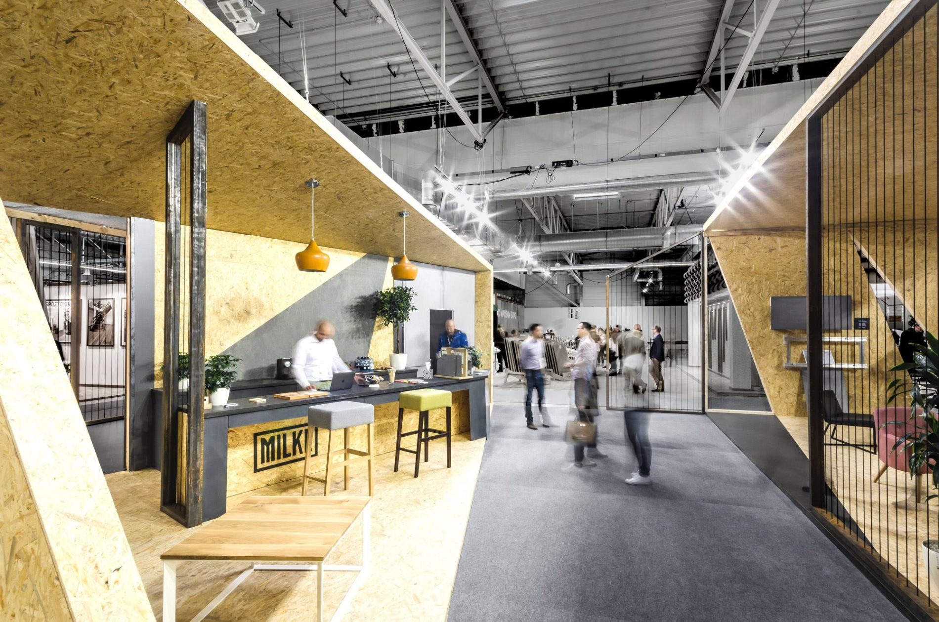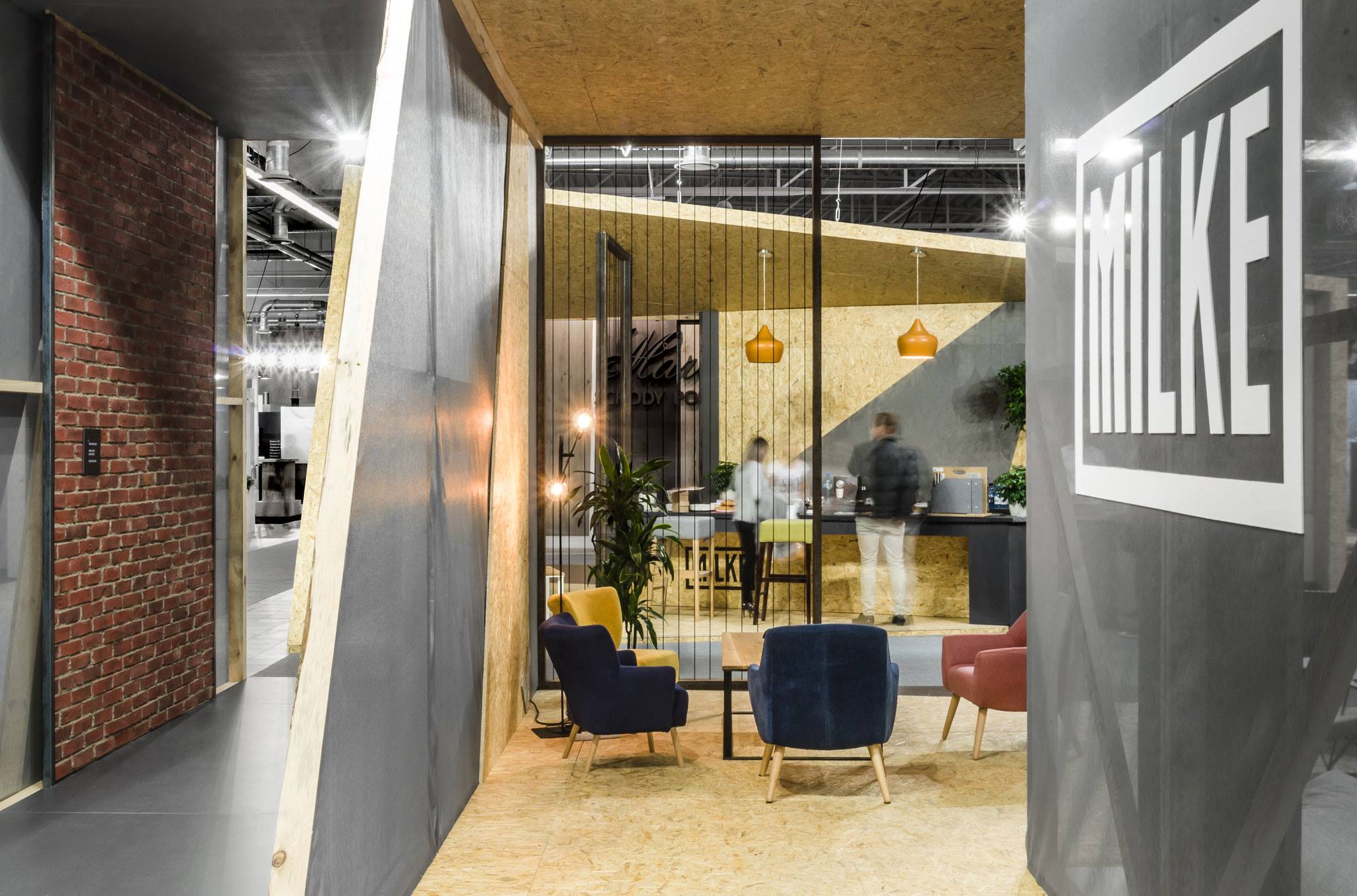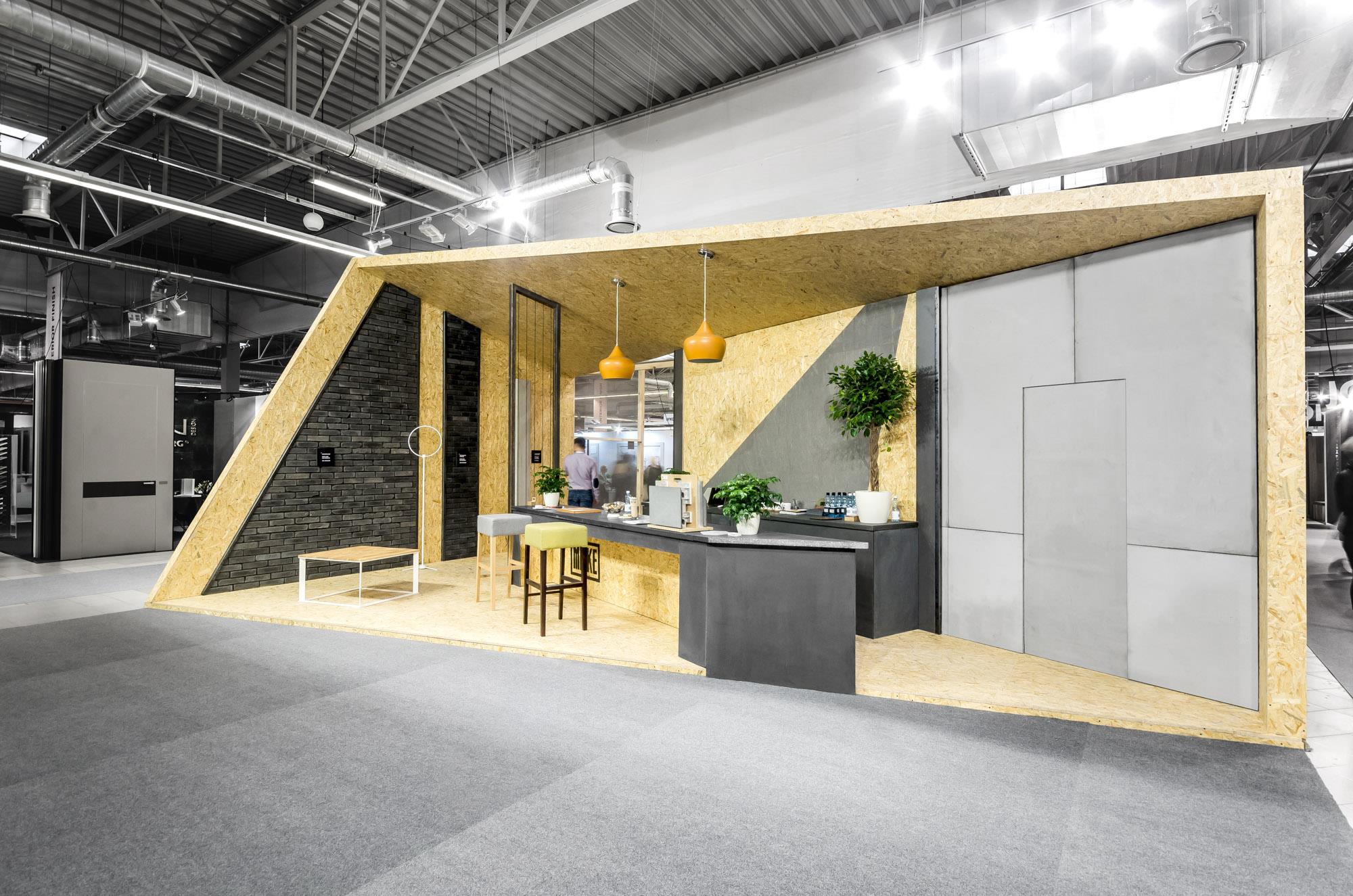 MILKE specjalizuje się w produkcji okładzin ściennych wewnętrznych i elewacyjnych z betonu architektonicznego w technologii GRC. Chcąc w pełni ukazać potencjał oferowanych przez MILKE produktów, projektanci z biura mode:lina™ wykorzystali sztandarowe rozwiązania marki jako element wykończenia ścian. Tym samym betonowe okładziny ścienne oprawiono w czarne ramy, na wzór logotypu oraz umieszczono na ścianach pawilonu nadając im kształty korespondujące z jego formą