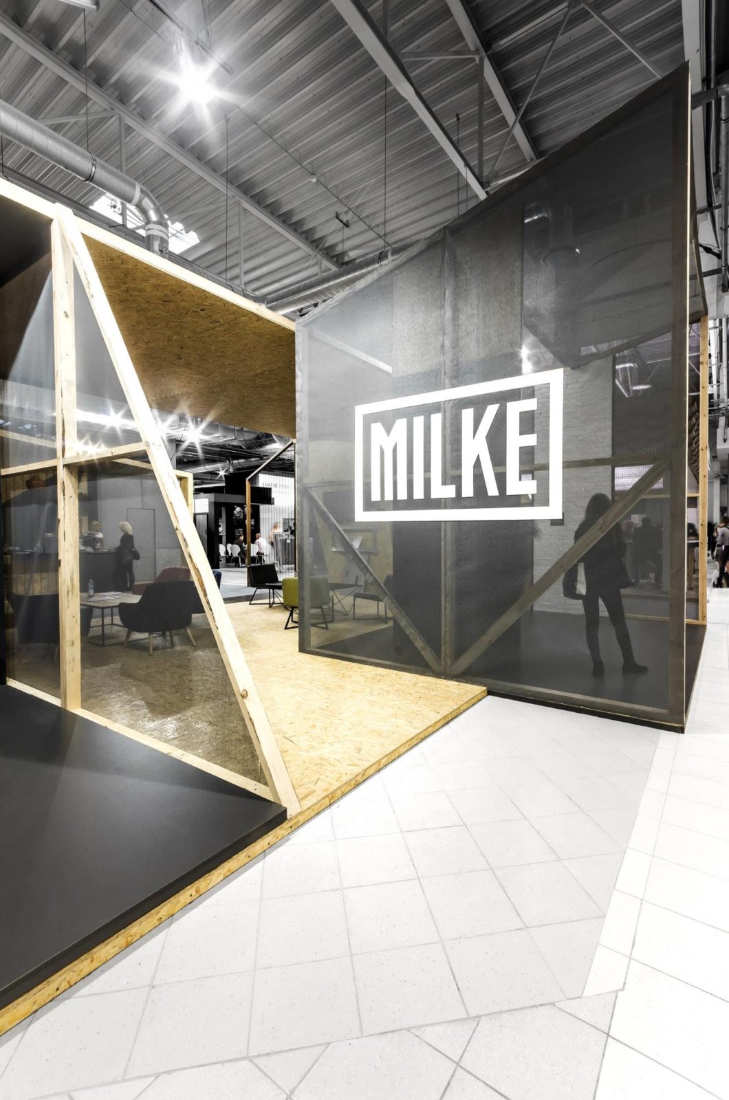 Pawilon targowy, za którym stoją projektanci z mode:lina™, to lekka ażurowa forma, nawiązująca do wyrazistej identyfikacji marki MILKE i jej głównego elementu – logotypu z jego charakterystycznym obramowaniem. Dlatego też, wykonane z siatki ażurowe elewacje pawilonu odkrywają jego drewniane ramy konstrukcyjne.