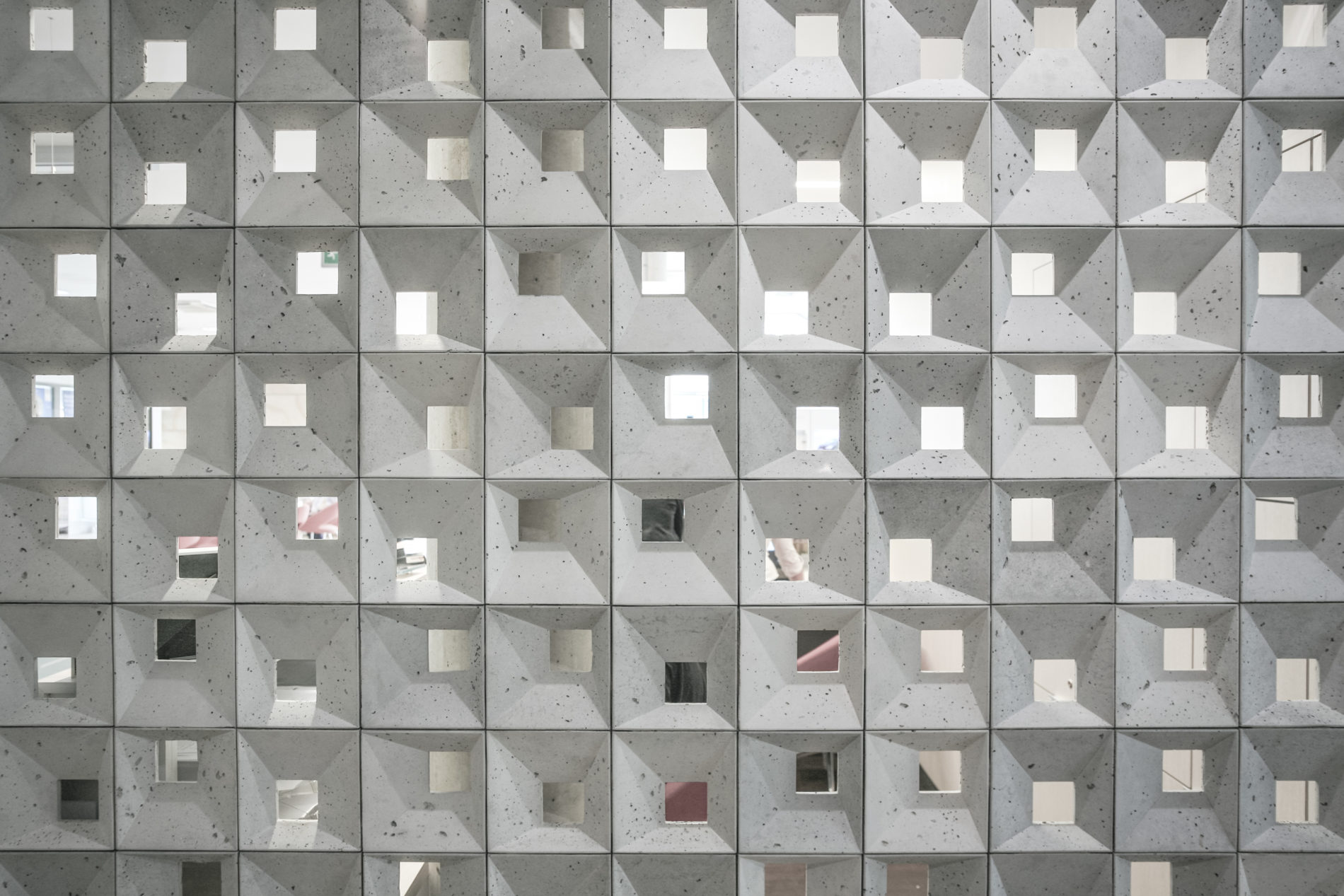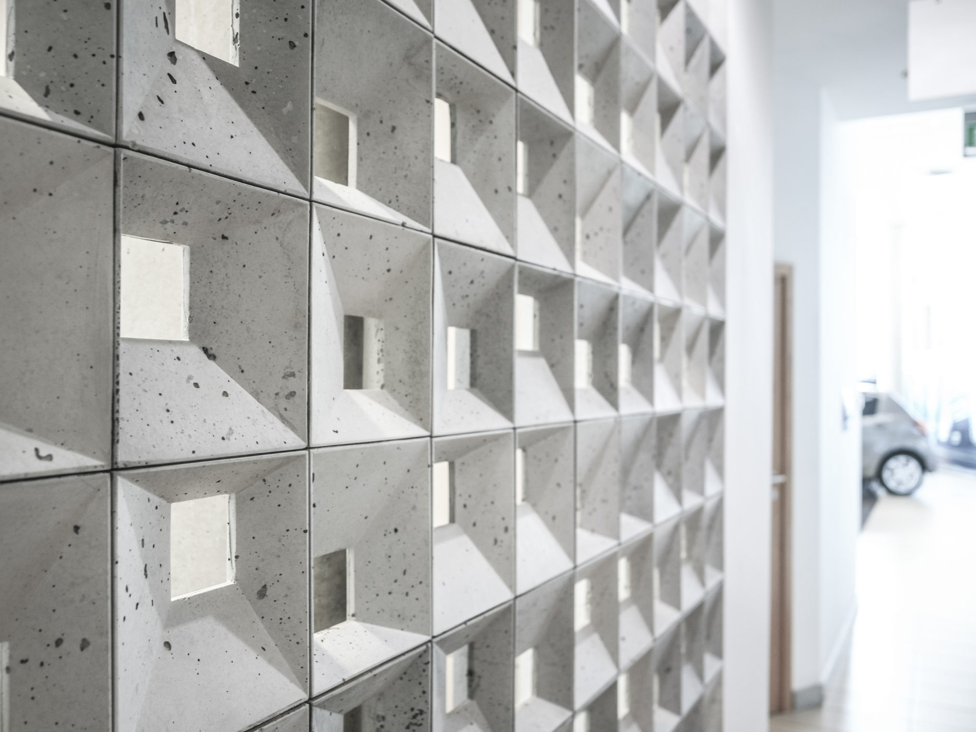 Bloczki 3D Block 1 z betonu architektonicznego - MILKE - TEKT Concrete - wnętrza salonu Carolina Toyota