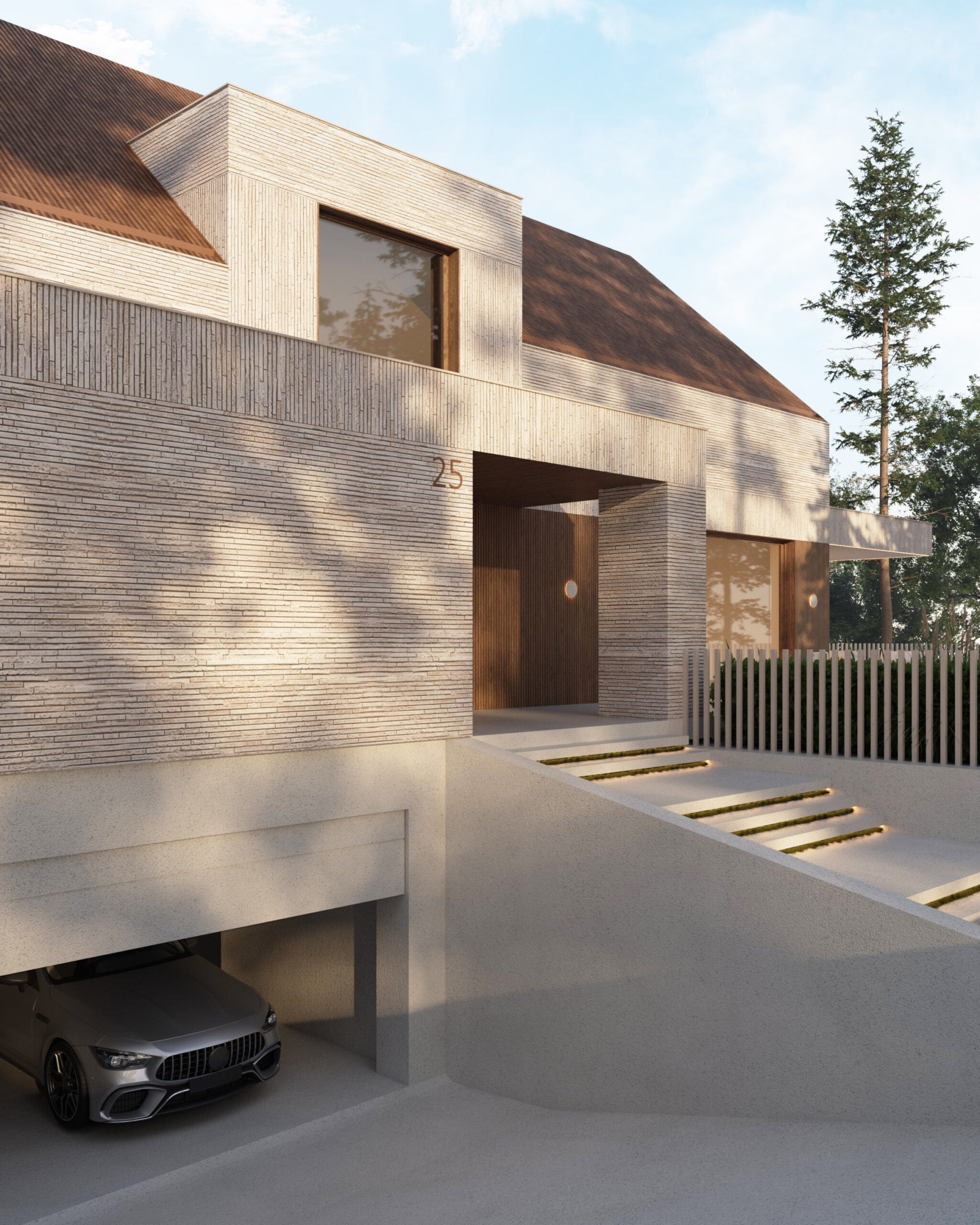 „(…) W architekturze budynku dużo się dzieje: 3 kondygnacje, zadaszenia wejściowe i nad tarasem, lukarny, murki oporowe… Aby uspokoić trochę bryłę postanowiłam zastosować zabieg montażu cegły w dwóch kierunkach – w pionie i poziomie. Podzieliłam więc elewację na poziome pasy wyrównane do charakterystycznych krawędzi np. okien oraz zadaszeń. Paradoksalnie, mimo że teraz na elewacji dzieje się znacznie więcej, wizualnie zapanował na niej porządek.”