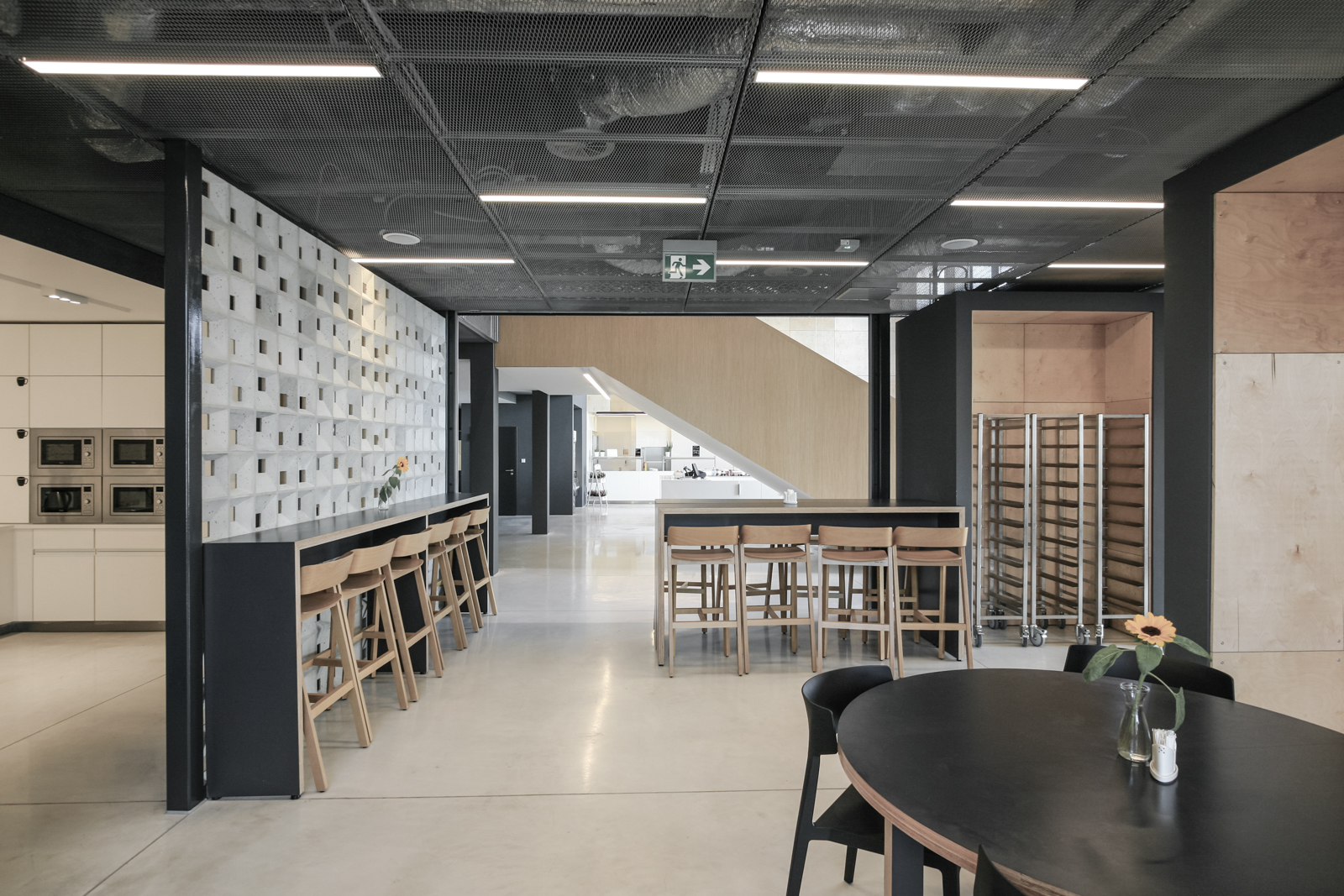 Ściana dzieląca przestrzeń w części jadalnej kantyny, dla pracowników Centrum Innowacji Fabryki Maszyn w Radomiu.