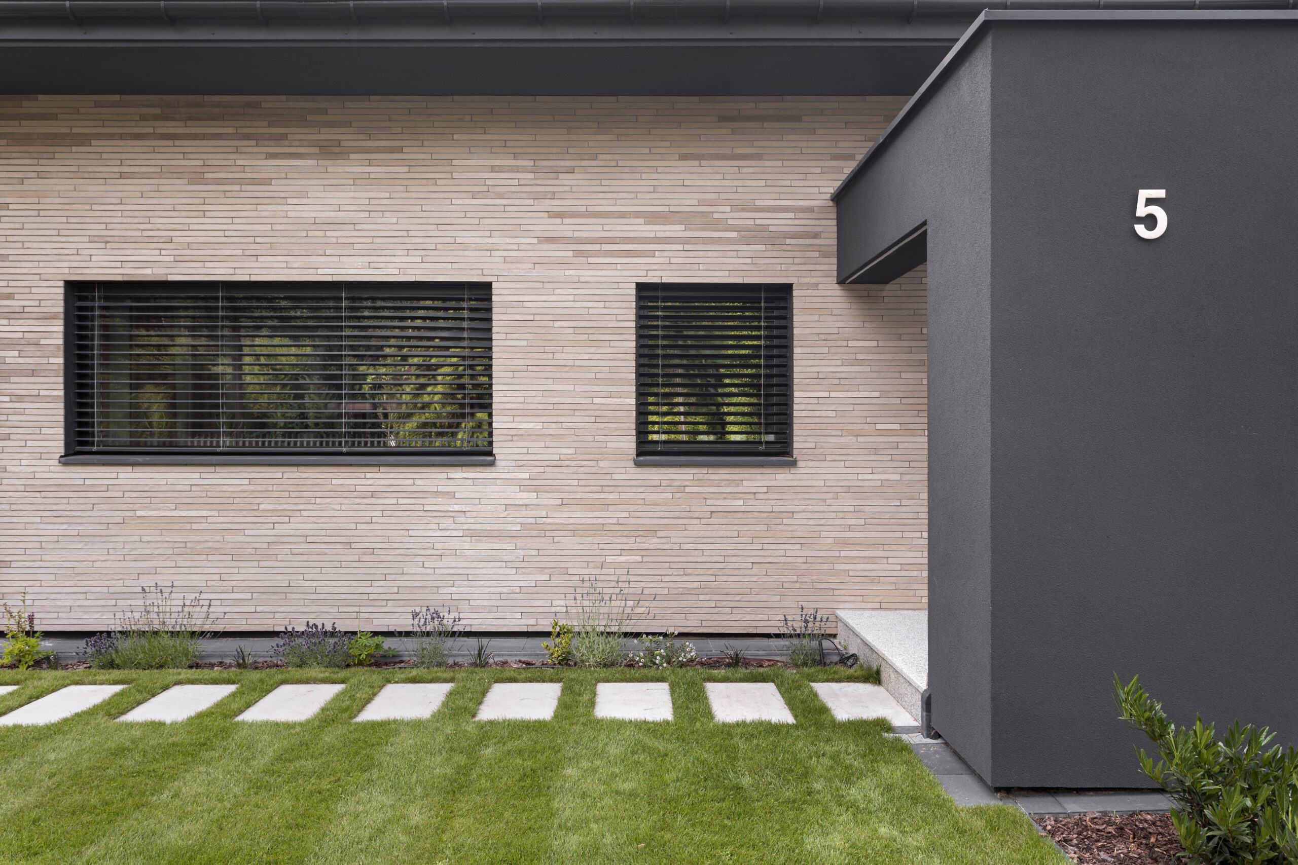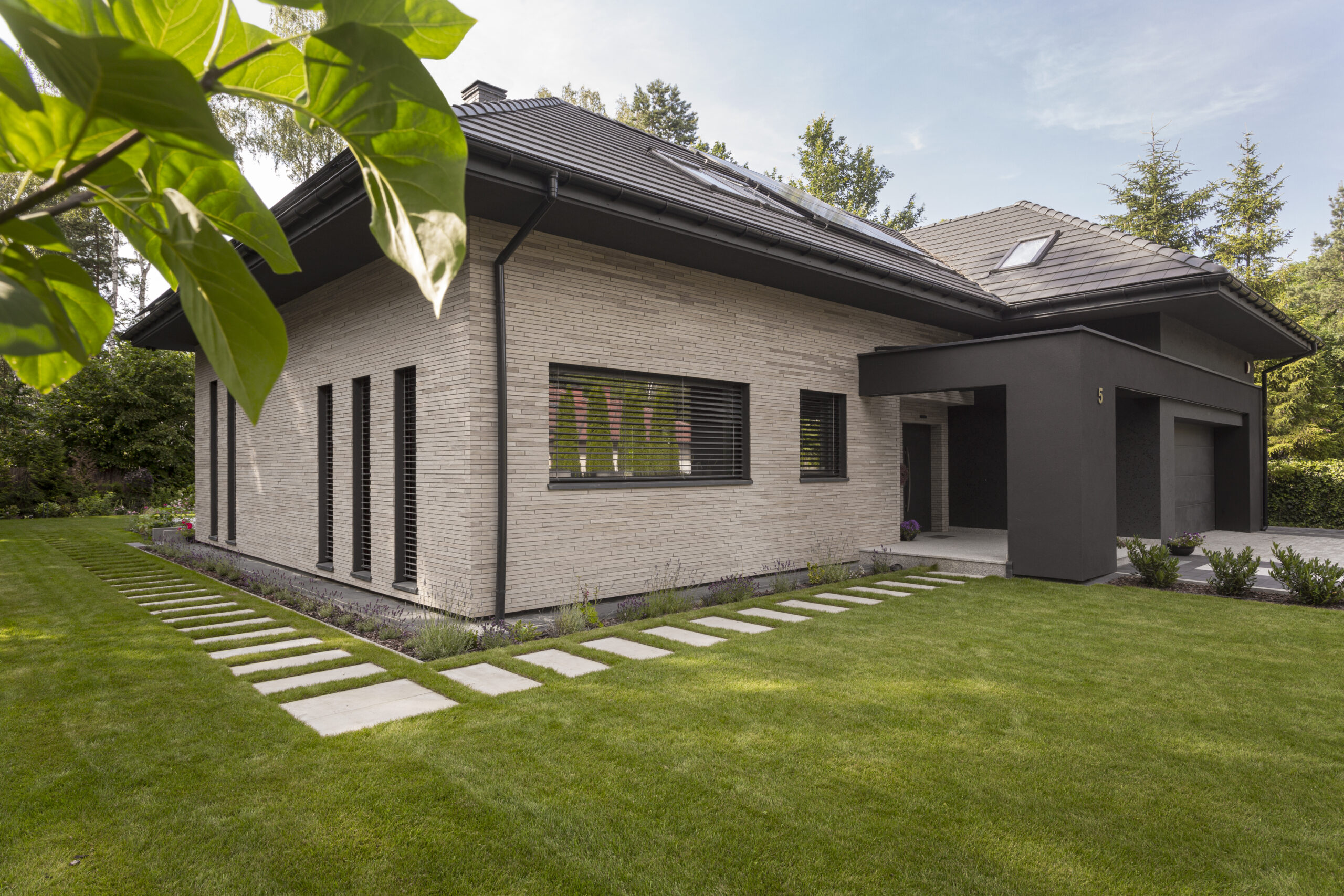 Na pewno w elegancji – niewymuszonej, takiej “wakacyjnej”. Zestawienie beżu i grafitowych elementów wykończeniowych, niegdyś szokujące, dziś należy już do kanonu. Inwestorzy zdecydowali się na odważny zabieg, polegający na wizualnym podziale bryły domu na dwie części – jedną obłożoną naszymi cegiełkami i drugą, gładko wykończoną kontrastowym, ciemnym tynkiem. W ten sposób bryła nabrała dynamiki, a poziome ułożenie płytek zarówno na elewacji, jak i ogrodzeniu sprawiło, że całość wydaje się mocno rozciągnięta horyzontalnie. Rozłożysta, zupełnie jak śródziemnomorskie wille.