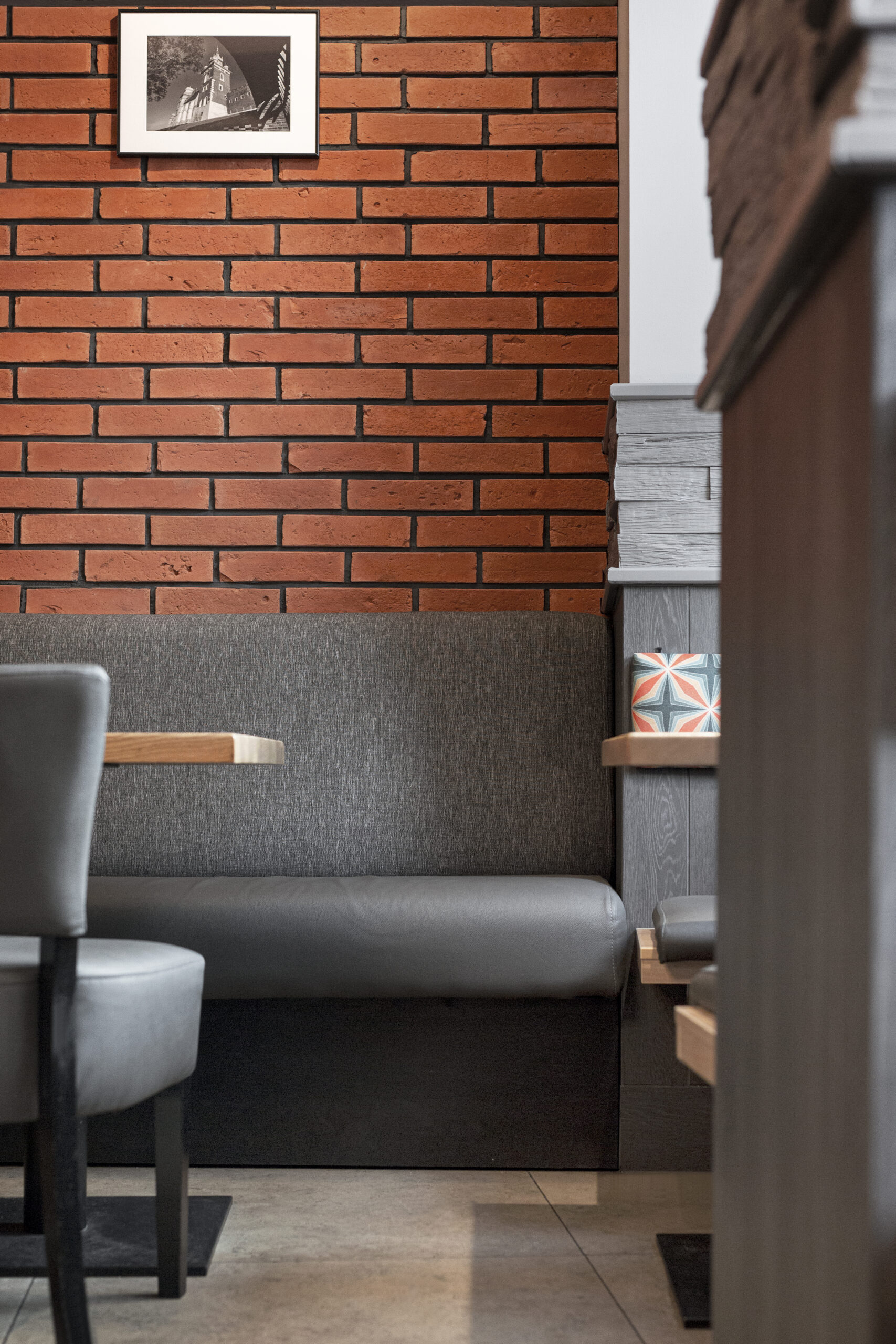Mocny rysunek Nowej Cegły w kolorze pomarańczowym podkreślają dodatkowo kontrastowe, antracytowe fugi. To doskonały trik, aby proste formy zyskały retro wyrazu. Kropkę nad “i” stawiają tu dodatki i elementy wyposażenia w korespondujących, pomarańczowych odcieniach, oraz obłędny aromat świeżego pieczywa.