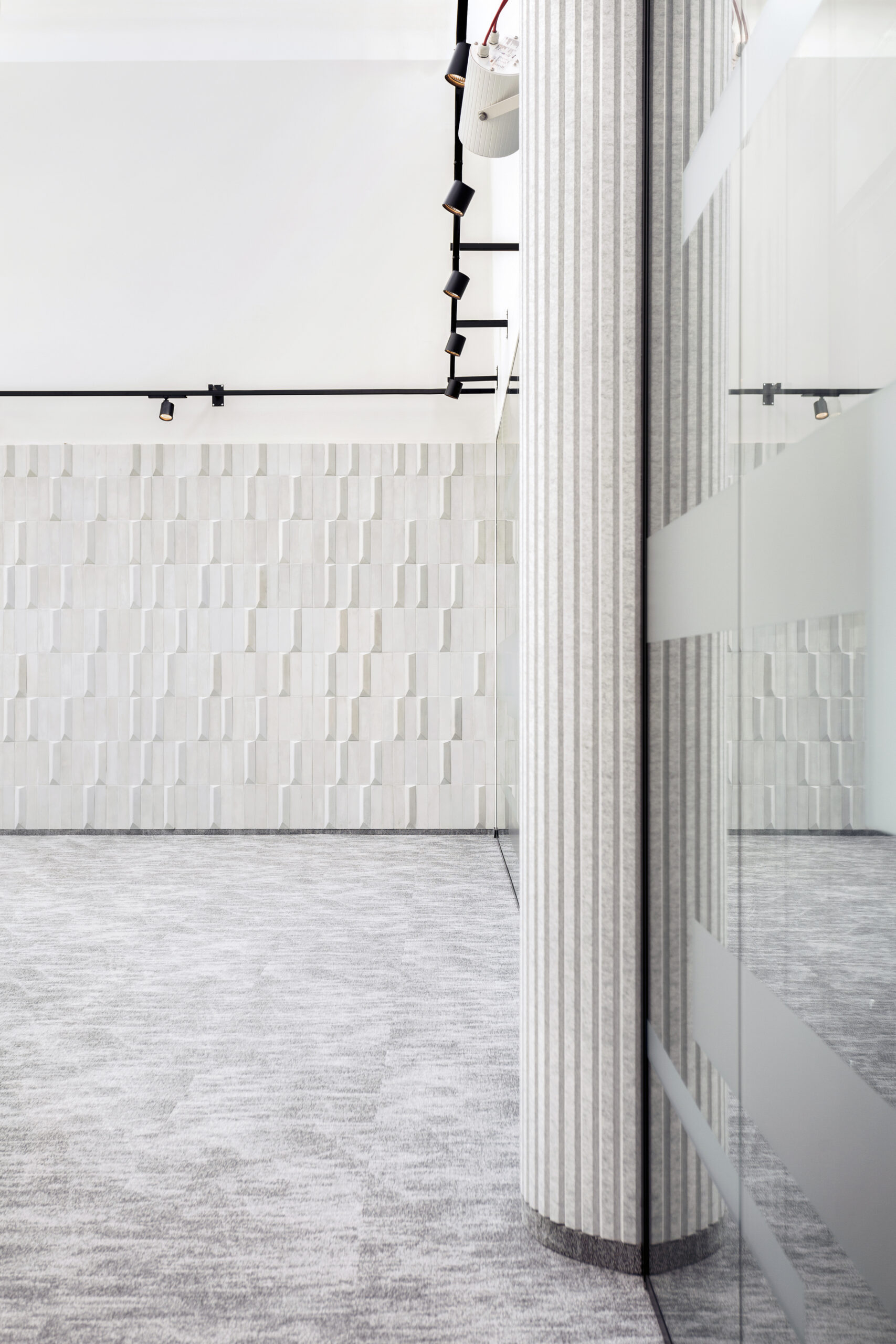 Podłużne, smukłe formy wyznaczają rytm i wprowadzają dynamikę do oszczędnych, minimalistycznych wnętrz. Po raz pierwszy możemy się na nie natknąć w lobby budynku, na parterze, gdzie przełamują geometrię ścian w kąciku wypoczynkowym. Odpowiednio podświetlone przypominają delikatne formy origami i aż proszą się o dotyk. Tu mamy kafle PLANK 1.