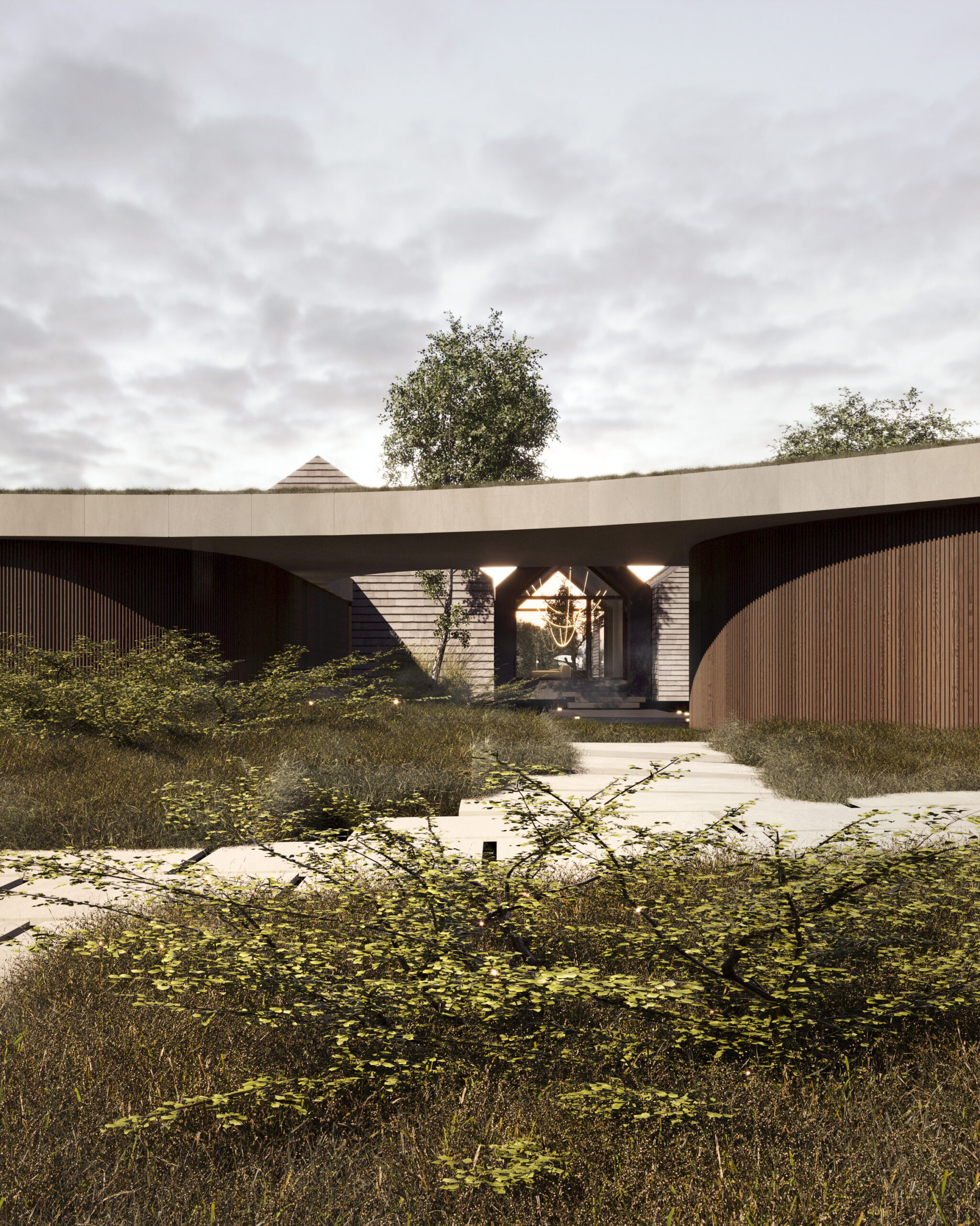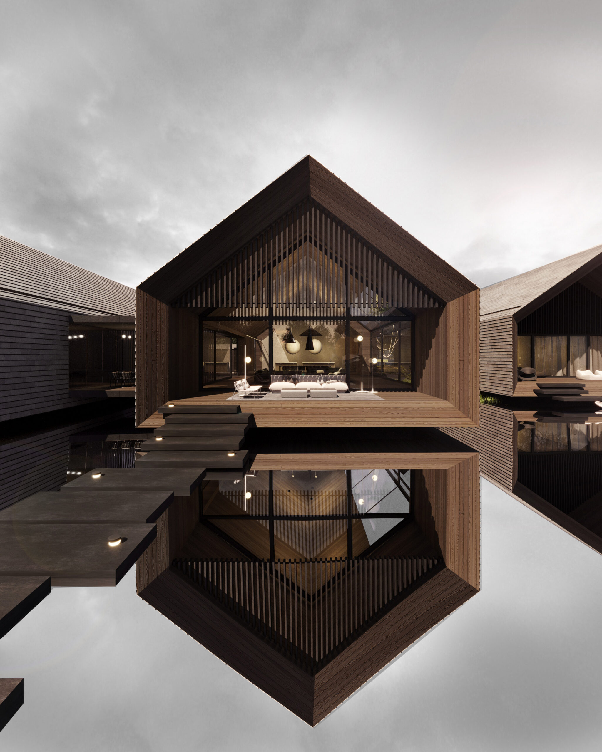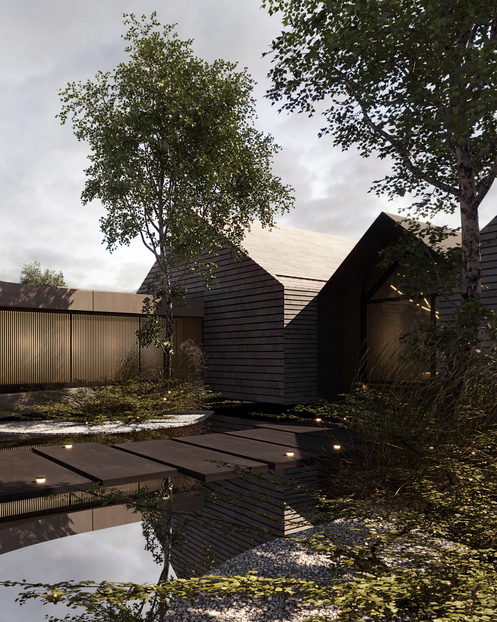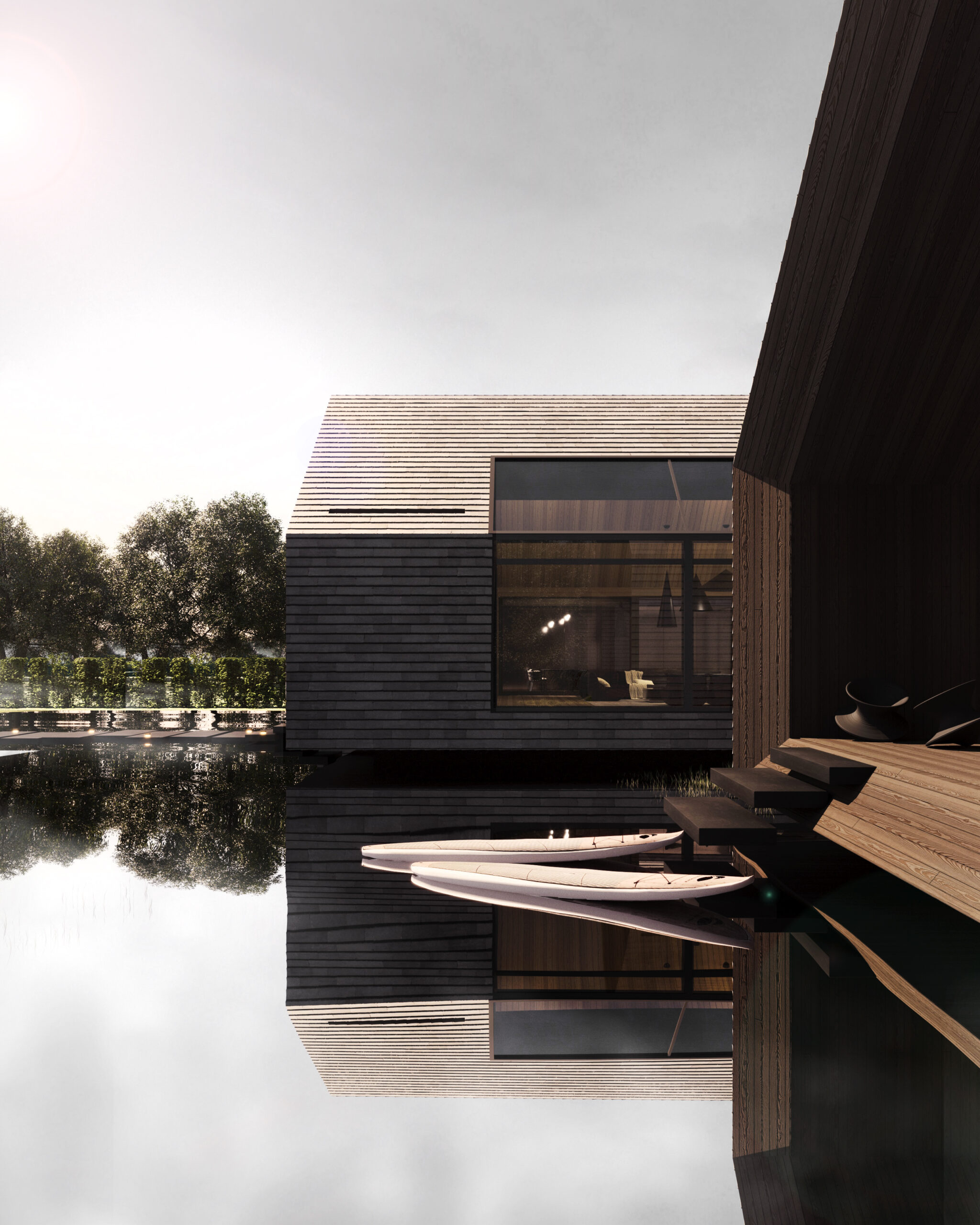 Projekt domu obejmuje pięć parterowych brył o dwuspadowych dachach, połączonych szklanymi łącznikami, oraz jedną horyzontalną bryłę z płaskim, zielonym dachem. Dom położony jest w malowniczej scenerii nad jeziorem, gdzie kompozycja brył tworzy urokliwy krajobraz. W projekcie przewidziano liczne miejsca do wypoczynku, doskonale sprzyjające relaksowi nad brzegiem jeziora.