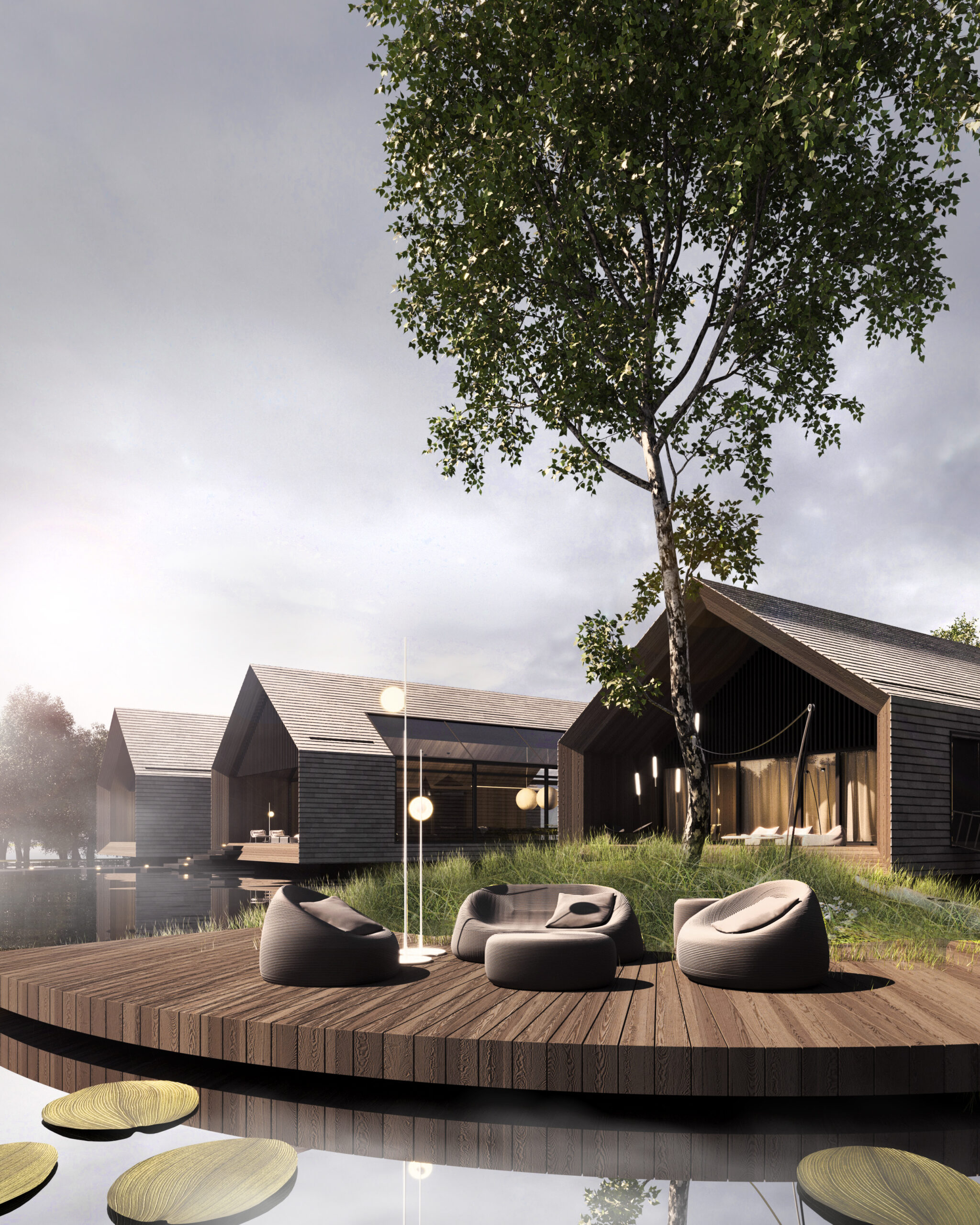 Z ogrodu rozpościera się jezioro z malowniczą wyspą, na której znajduje się mały taras wypoczynkowy, osiągalny np. za pomocą deski wodnej. Dodatkowo, na wyspę prowadzi większy taras z częścią wypoczynkową, leżakami, jacuzzi i paleniskiem, dostępny poprzez płyty betonowe. Taka architektura łączy funkcjonalność, elegancję i komfort, tworząc unikalne otoczenie do życia i wypoczynku.