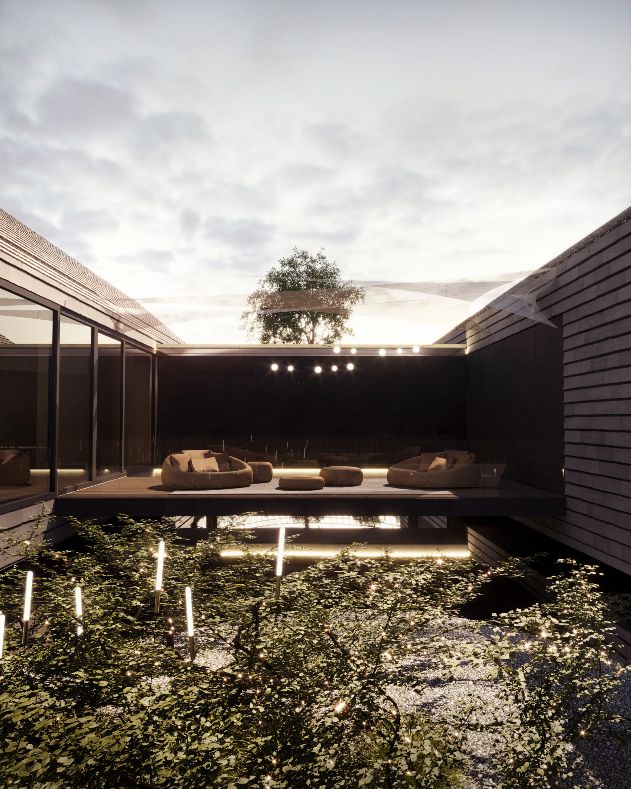 Cała posiadłość charakteryzuje się eleganckim designem i funkcjonalnym rozplanowaniem. Na wjeździe do posesji gości patio z dekoracyjnym zbiornikiem wodnym, tworząc przyjemne powitanie. Sypialnia posiada swoje prywatne patio z tarasem, również z ozdobnym zbiornikiem wodnym, co stanowi urokliwe miejsce do relaksu.