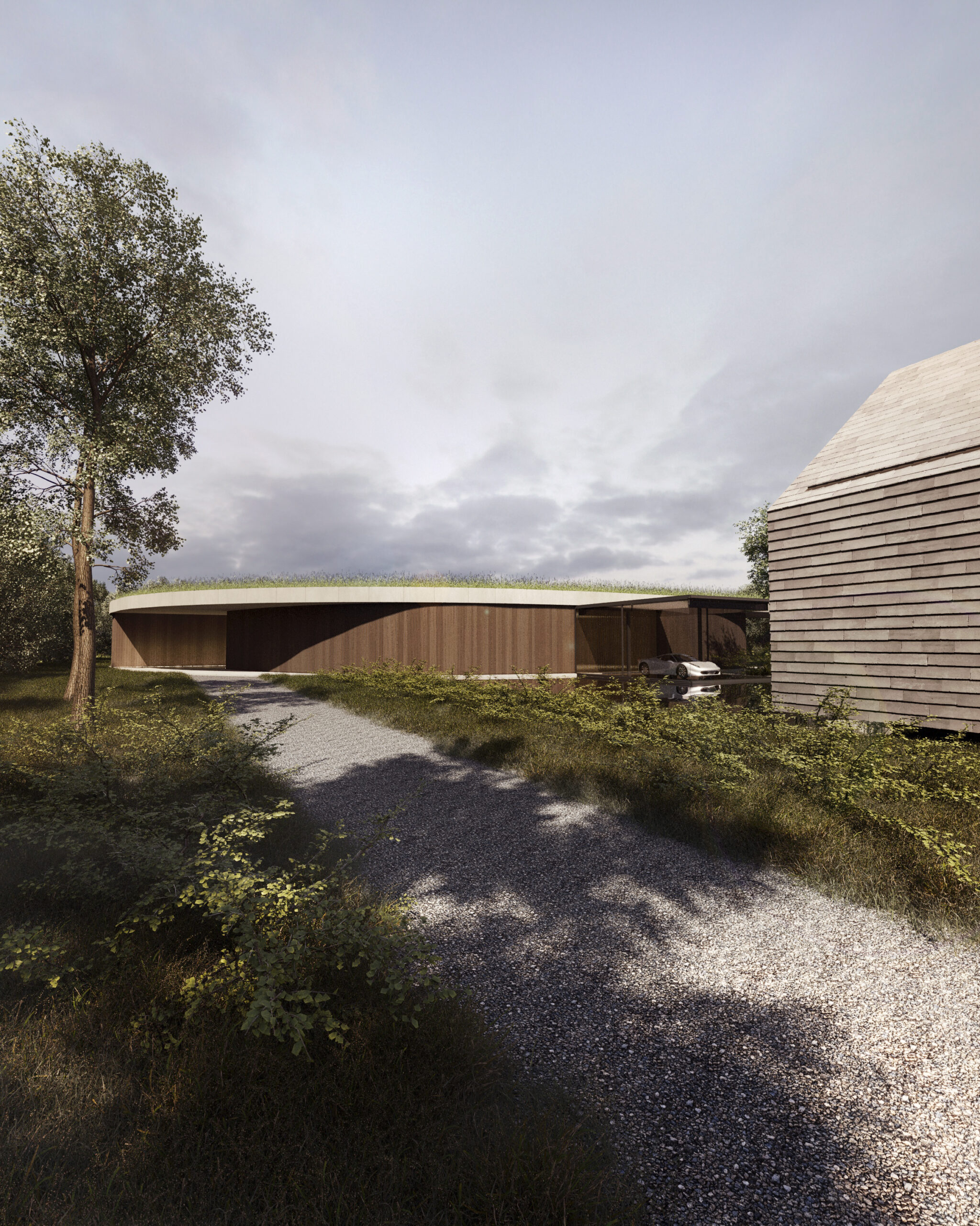 Trzy garaże znajdujące się w parterowej, płaskiej bryle o obłym kształcie pełnią różnorodne funkcje. Pierwszy z nich to garaż na sprzęt oraz pojazdy sportowe, drugi na samochody do codziennego użytku, a trzeci na samochody kolekcjonerskie, wyposażony dodatkowo w gablotę na eksponowanie samochodu sportowego.